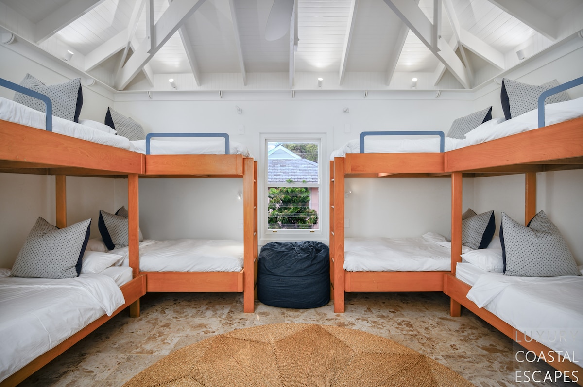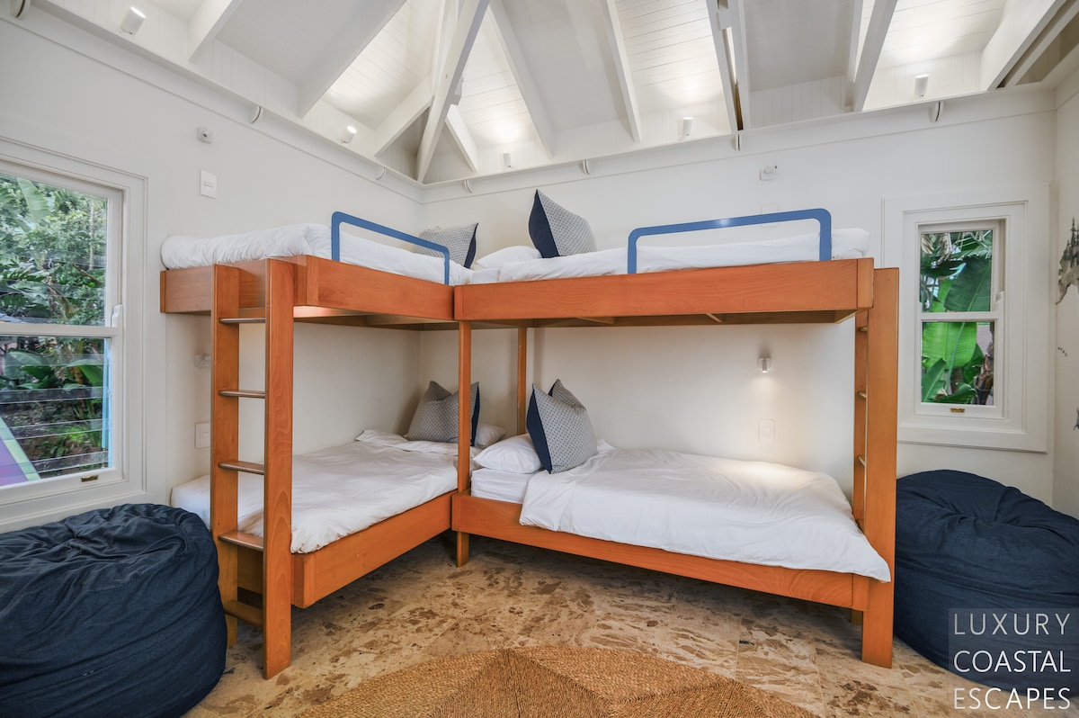 Bedroom Five: Bunk Room with four built-in double bed bunks, ceiling fan and air-con, built-in cupboards, en-suite with shower, open plan toilet and single basin.