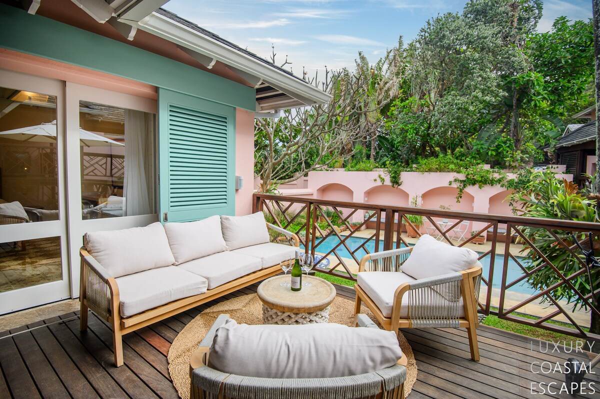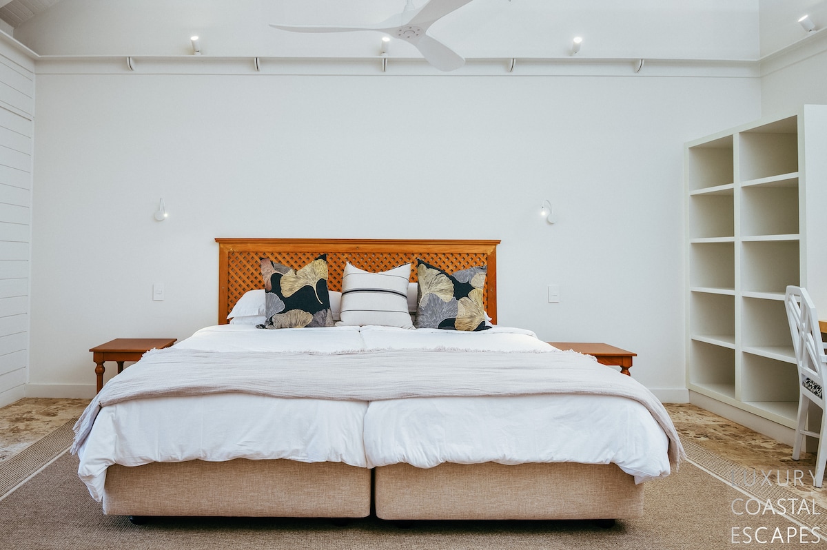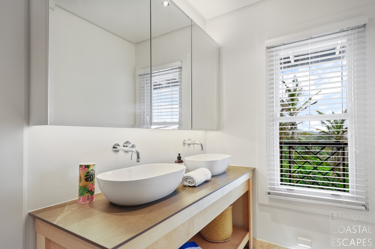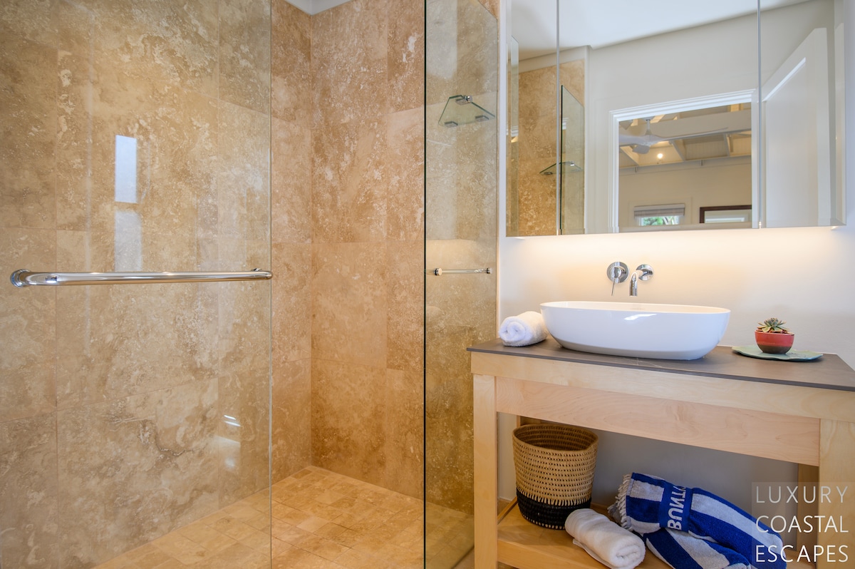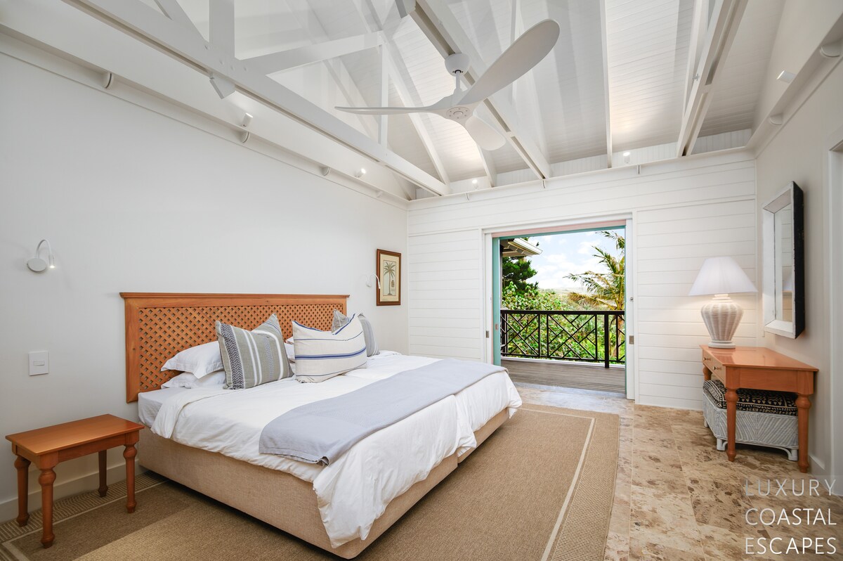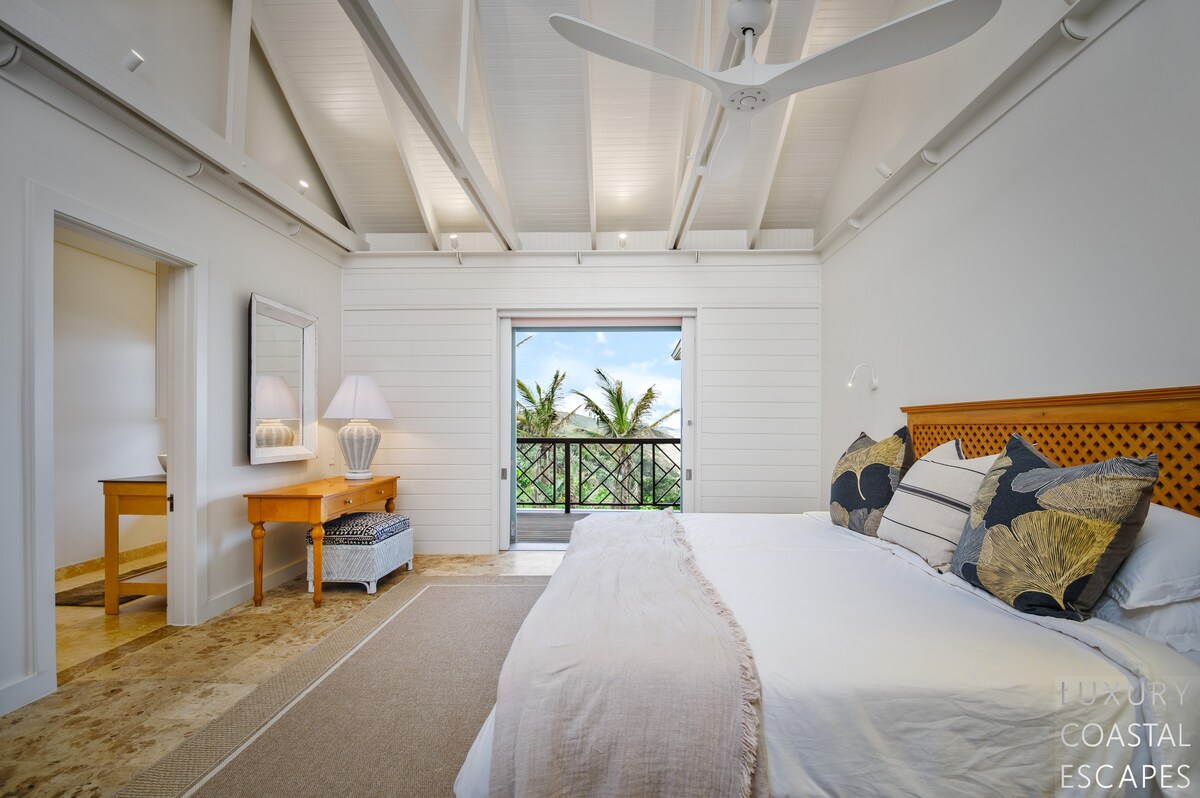 Bedroom Six: Twin beds apart, ceiling fan and air-con, access to a balcony and access to the pool and deck. En-suite with shower, open plan toilet and double basin.