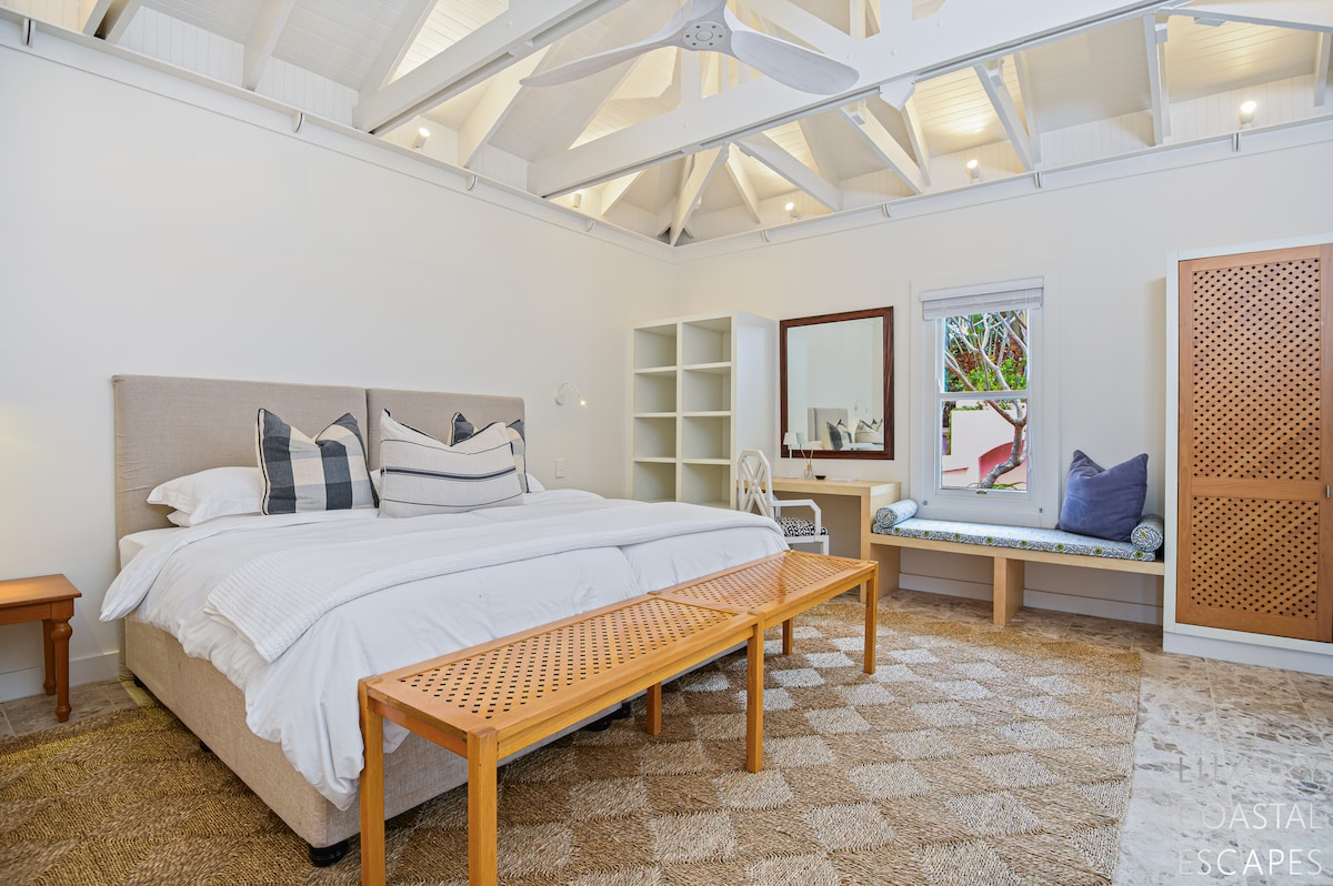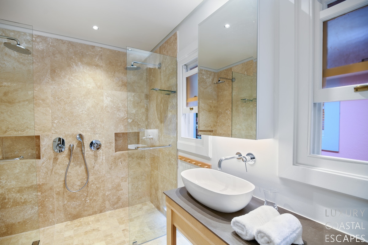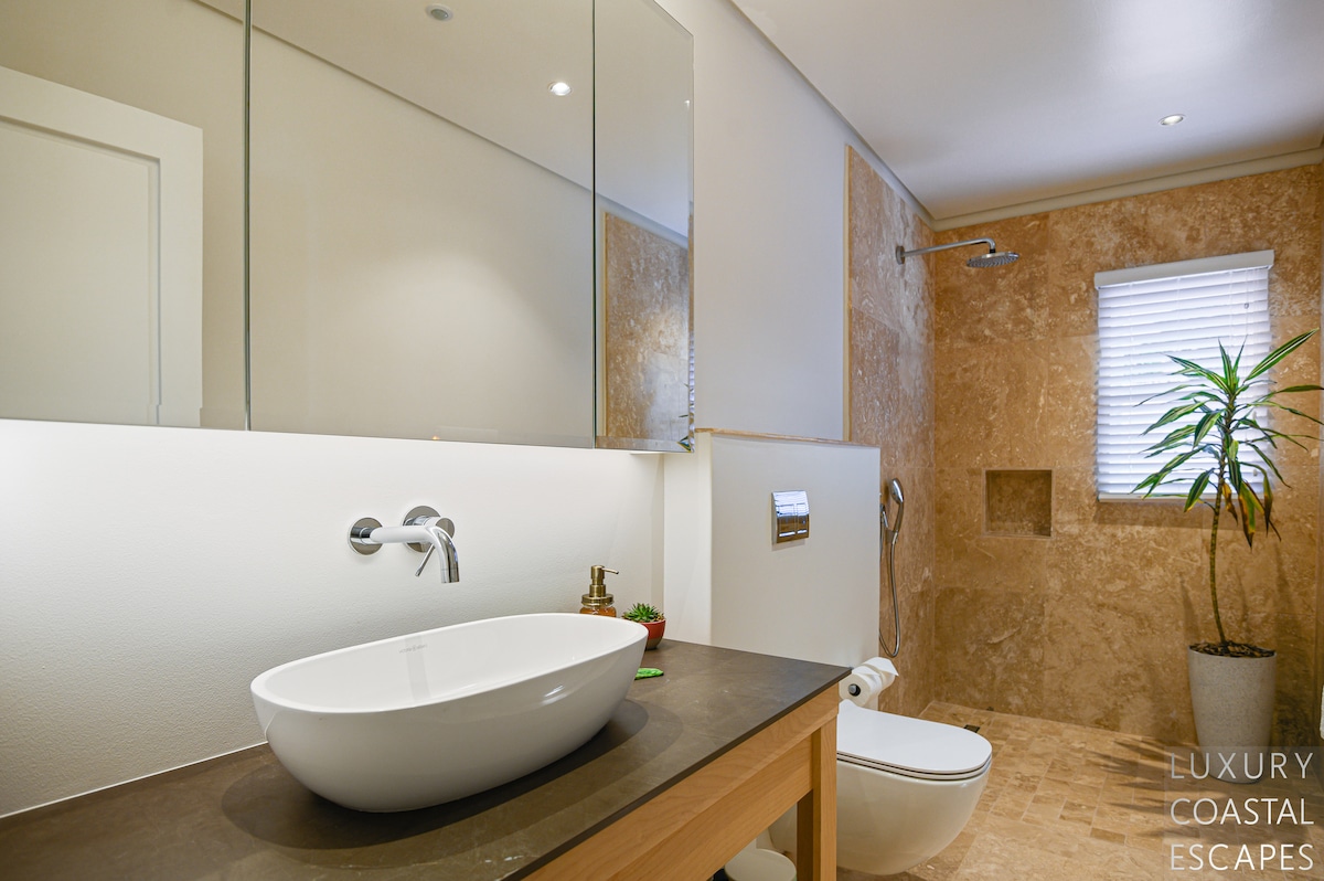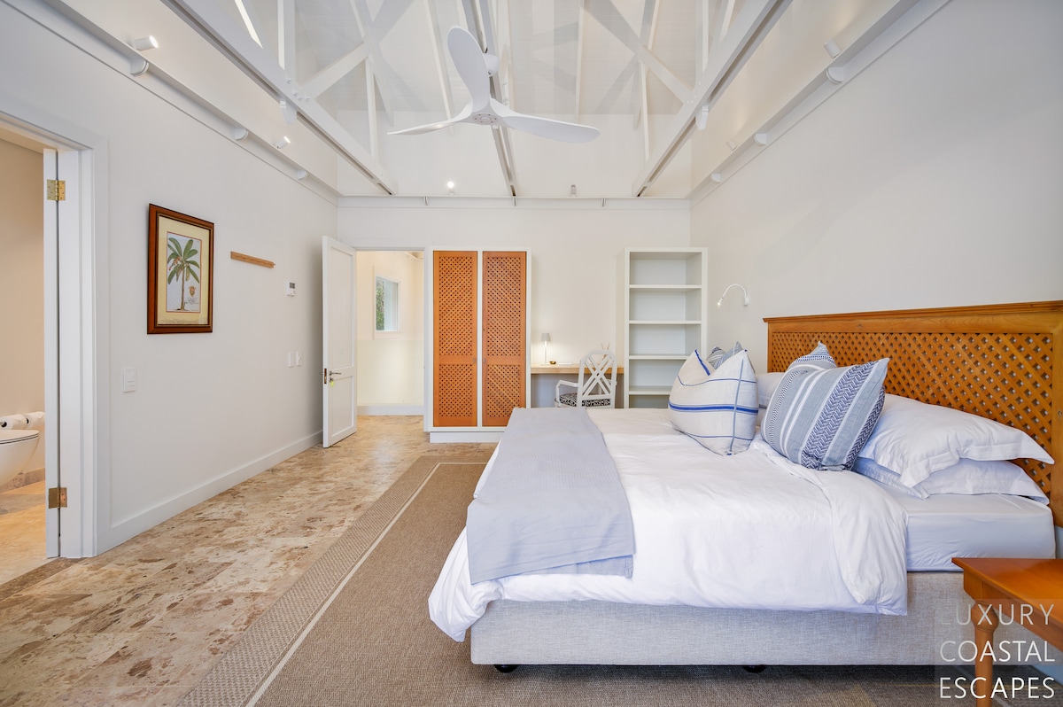Bedroom Two: Twin beds apart (can be made up of a king bed), ceiling fan and air-con, dressing table, sea views and access to a balcony. En-suite with shower, and double basin.