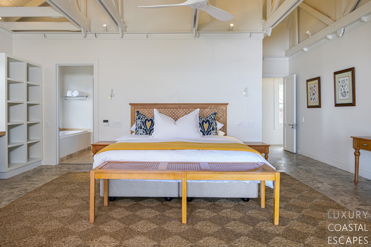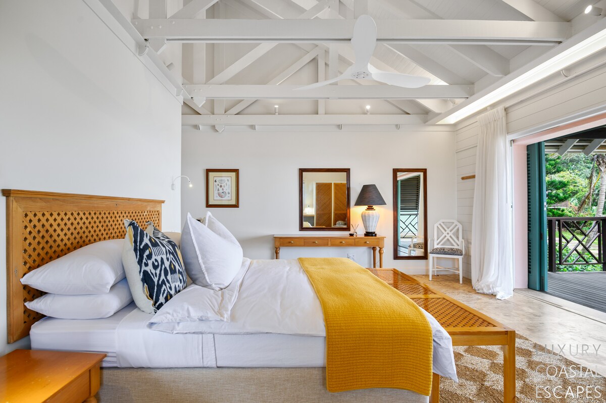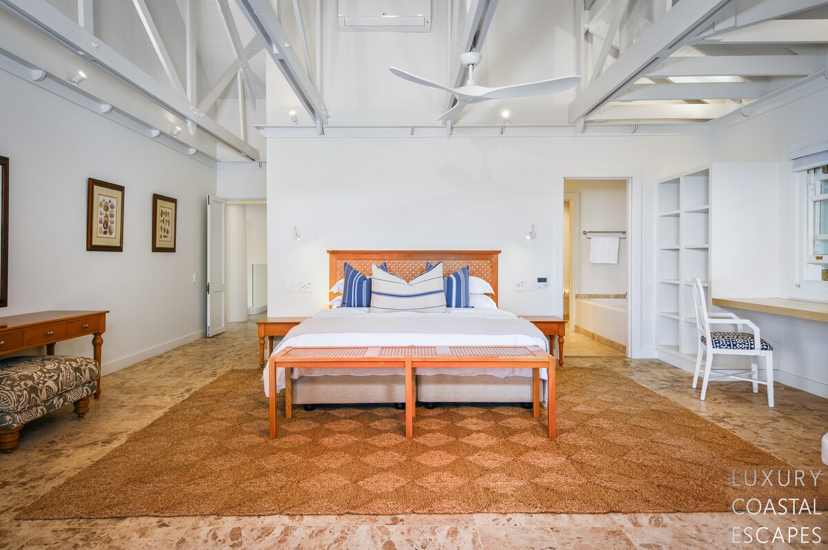Bedroom One: King-size bed, ceiling fan and air-con, dressing table, sea views and access to a balcony. En-suite with bathtub, shower, and double basin.