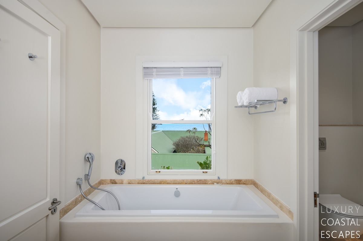 Bedroom Four: King-size bed, ceiling fan and air-con, dressing table, sea views and access to a balcony. En-suite with bathtub, shower, and double basin.