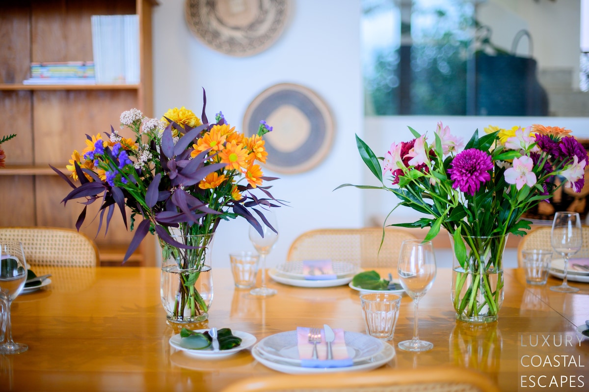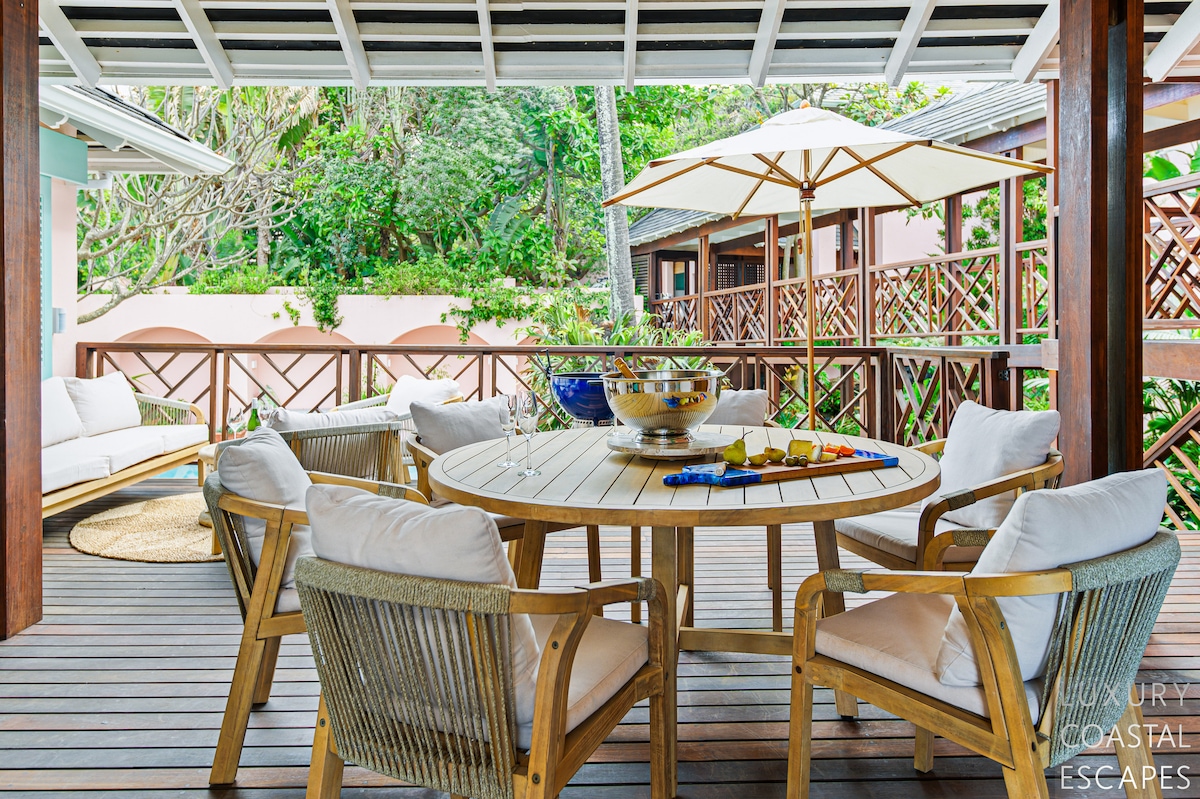 Outside dining table on the front deck for 12 guests and a large round table and chairs on the back veranda which seats 6 guests