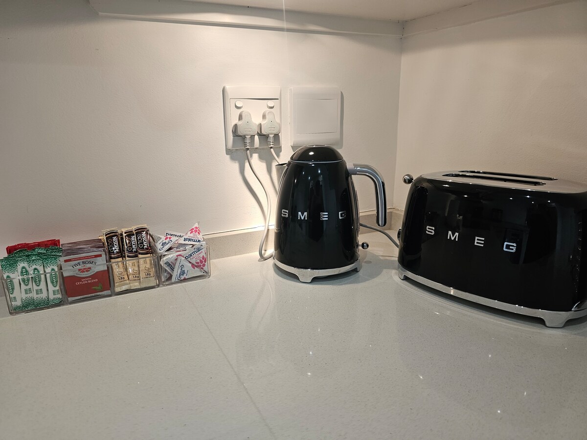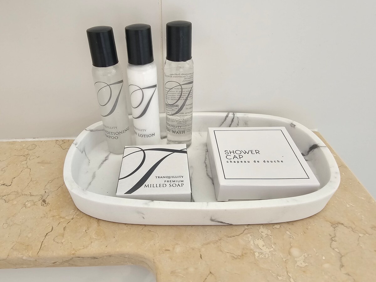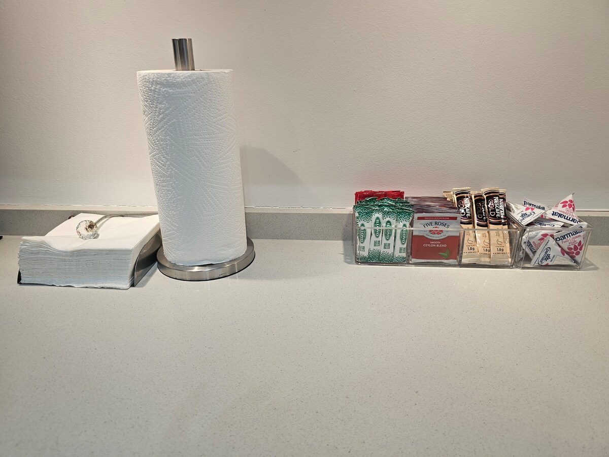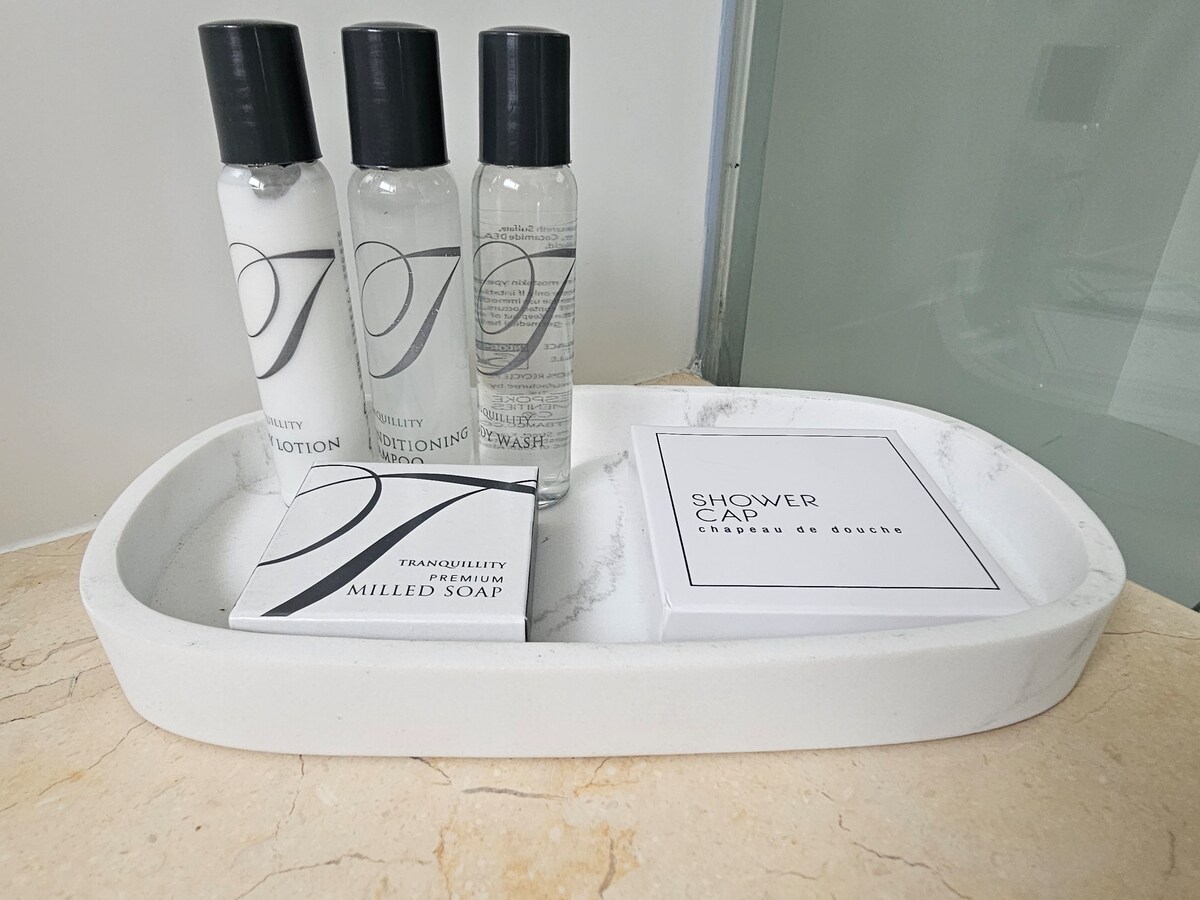 Coffee, tea, and bathroom amenities provided.