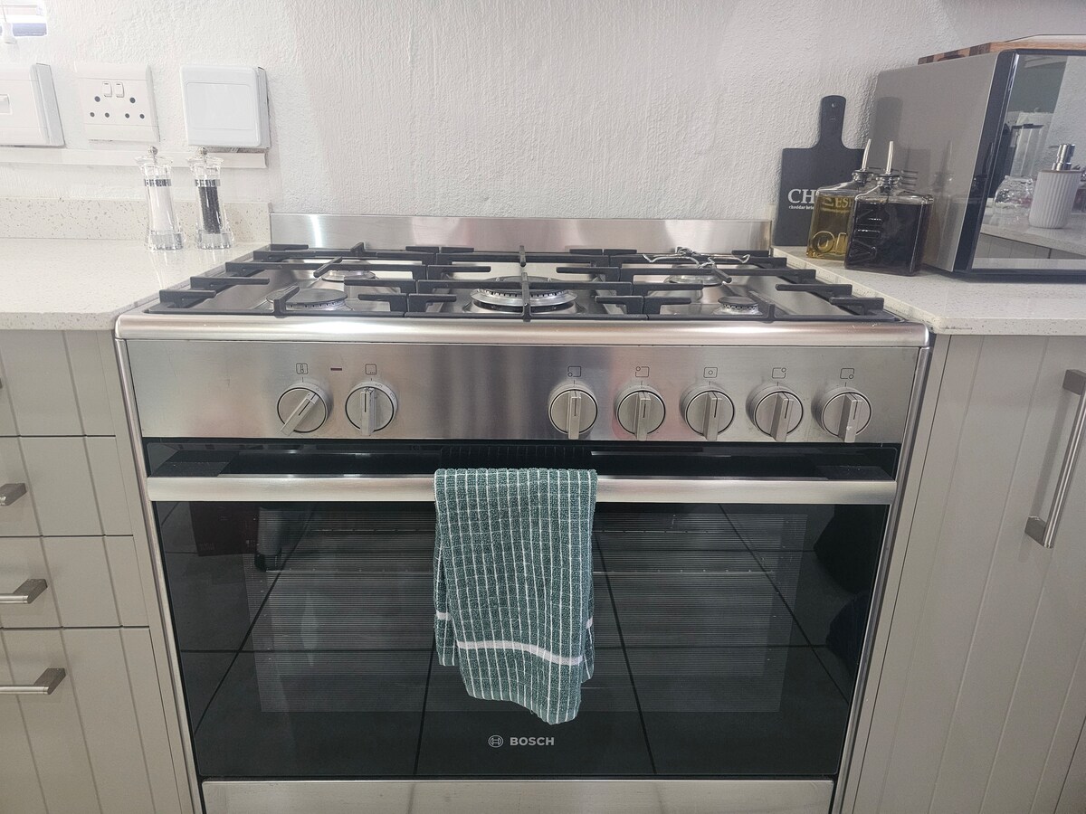 The home is equipped with a gas geyser, gas hob, and electric oven for your convenience.