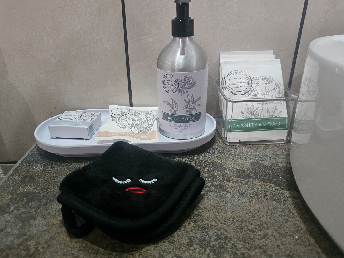 Bath and swimming towels, tea, coffee and sugar are provided. Environment friendly soap, shampoo, shower gel and body lotion also provided, and the shower caps and packaging are all biodegradable.