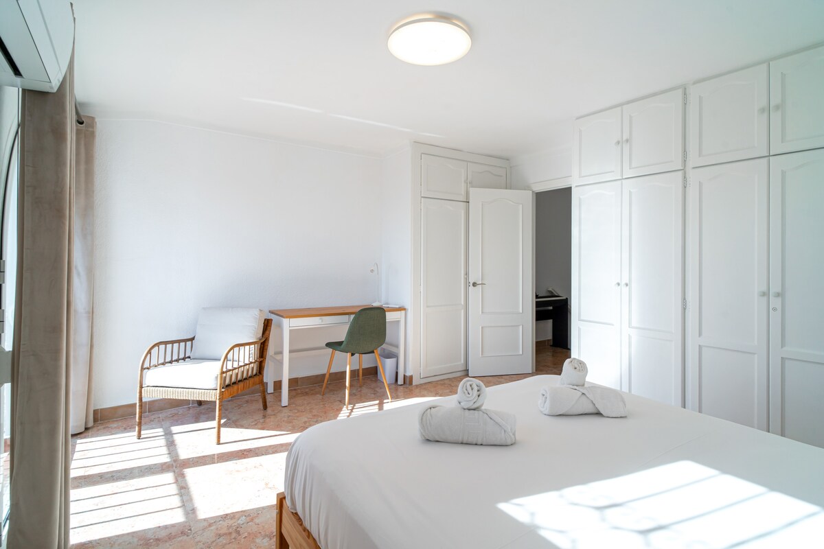 Master bedroom with queen size bed (160x200), built-in wardrobe, desk and sea views.
