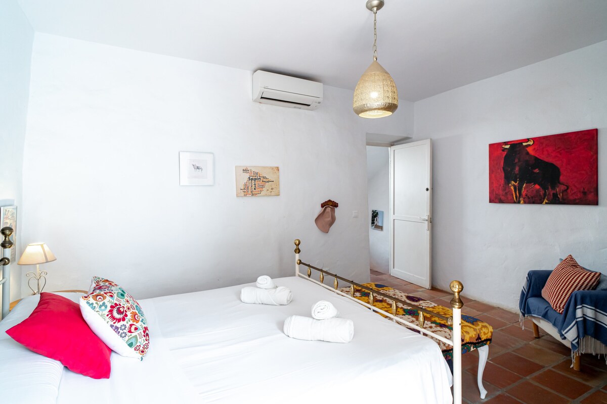 As you enter, you are greeted by a large fully equipped kitchen, next to a cosy living room with international Tv and high speed internet. Also on the ground floor you will find a master bedroom with double bed, which connects to a beautiful Andalusian patio. Across the courtyard, a separate bedroom with en-suite bathroom ensures maximum privacy, ideal for couples or companions who want their own space. Above this room, a small terrace with chill-out sofa becomes the perfect spot to relax, accessible via a spiral staircase.