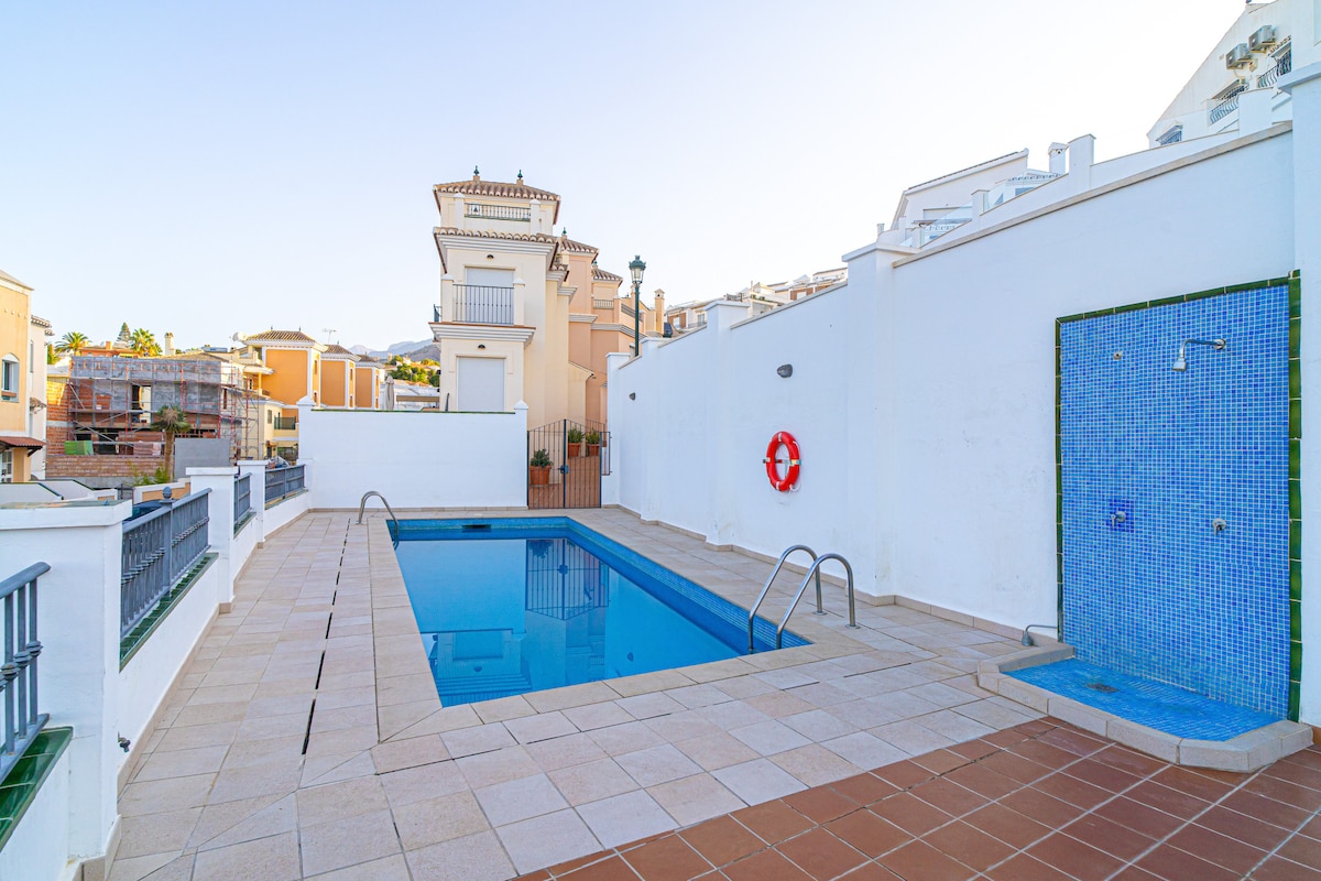 Had a 10 day stay in the apartment. Great apartment - very clean modern with 2 separate balcony’s and a roof roof terrace. More than enough space for 6 people. garage was very useful as the area can get busy. Looked like 7 apartments in the complex but a decent size pool Well located about 8 minute walk to the main Burriana beach. It is a hill. The area can get really busy at weekends as people part on the road for the beach. Nerja as a resort is really nice, it’s about 20 mins walk to the main area. .
