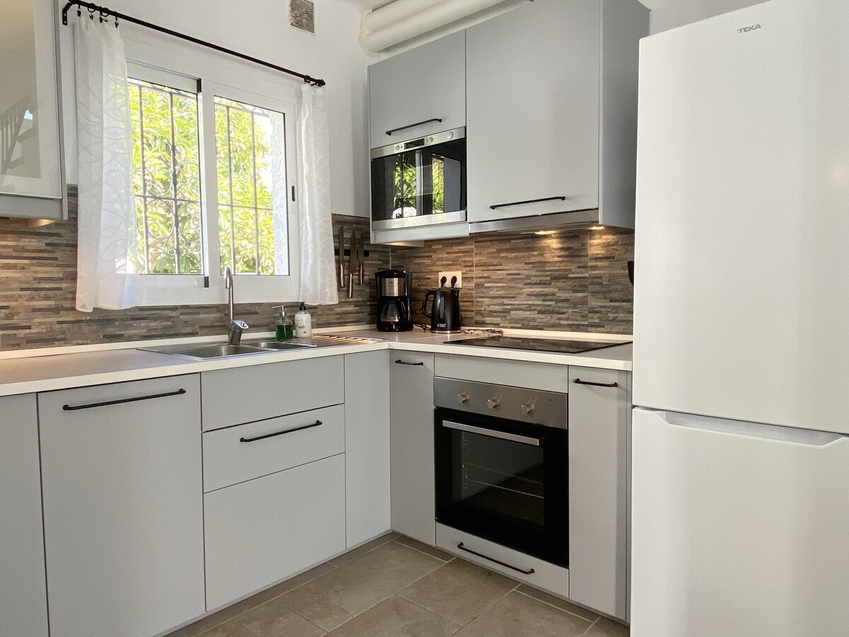 The fully equipped brand-new kitchen is in bright and spacious open floor plan with sofas, dining area and it has everything you might need to make the most of your vacation, such as induction hob, oven, microwave, and dishwasher.