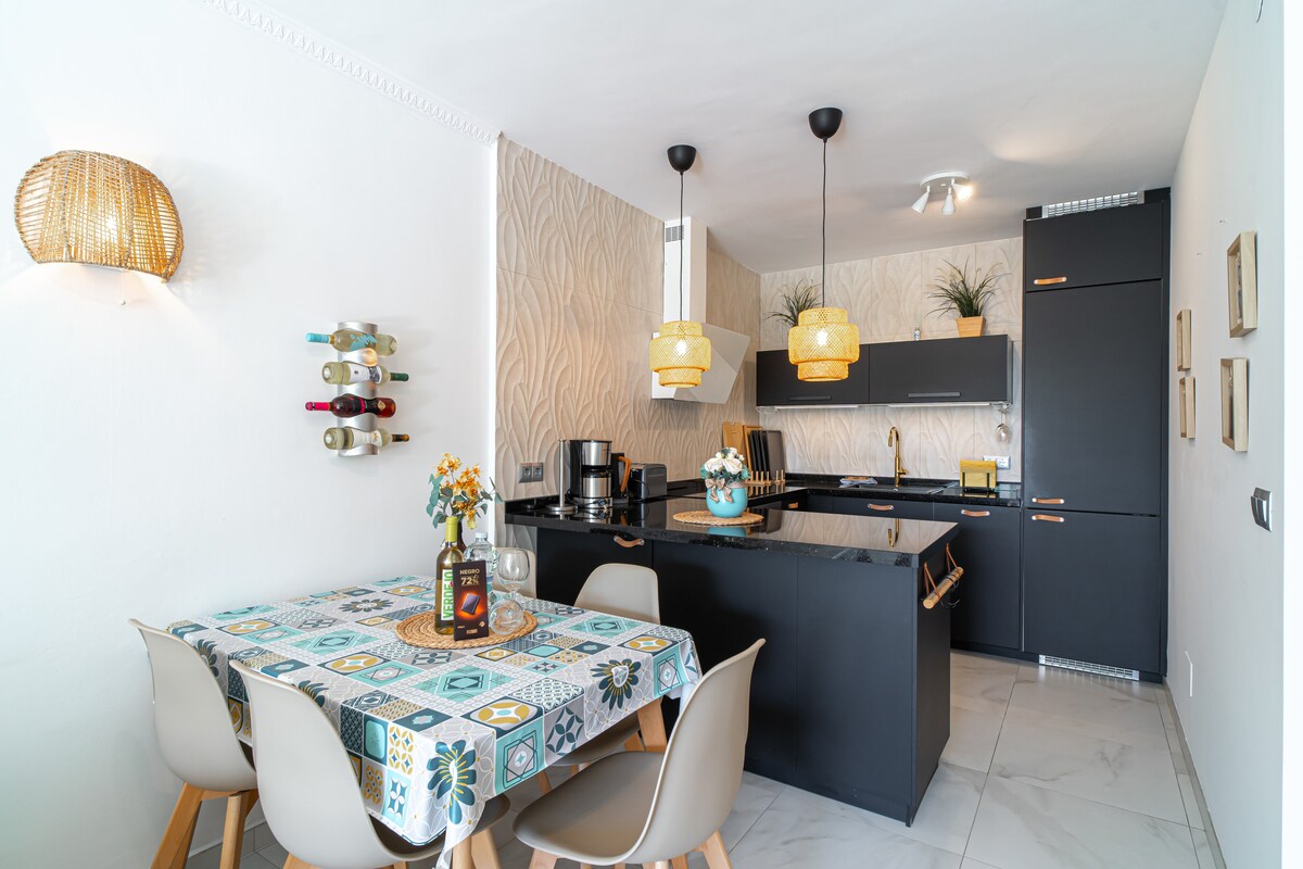 Just 50 metres from the flat, a plethora of facilities awaits you, including a supermarket, several bars and restaurants, a spacious communal swimming pool with dedicated children's area, and stunning views of the sea and mountains. Don't forget to visit our famous chef Sergio Paloma's Rooftop Bar Kanema, located nearby, for an unforgettable experience.