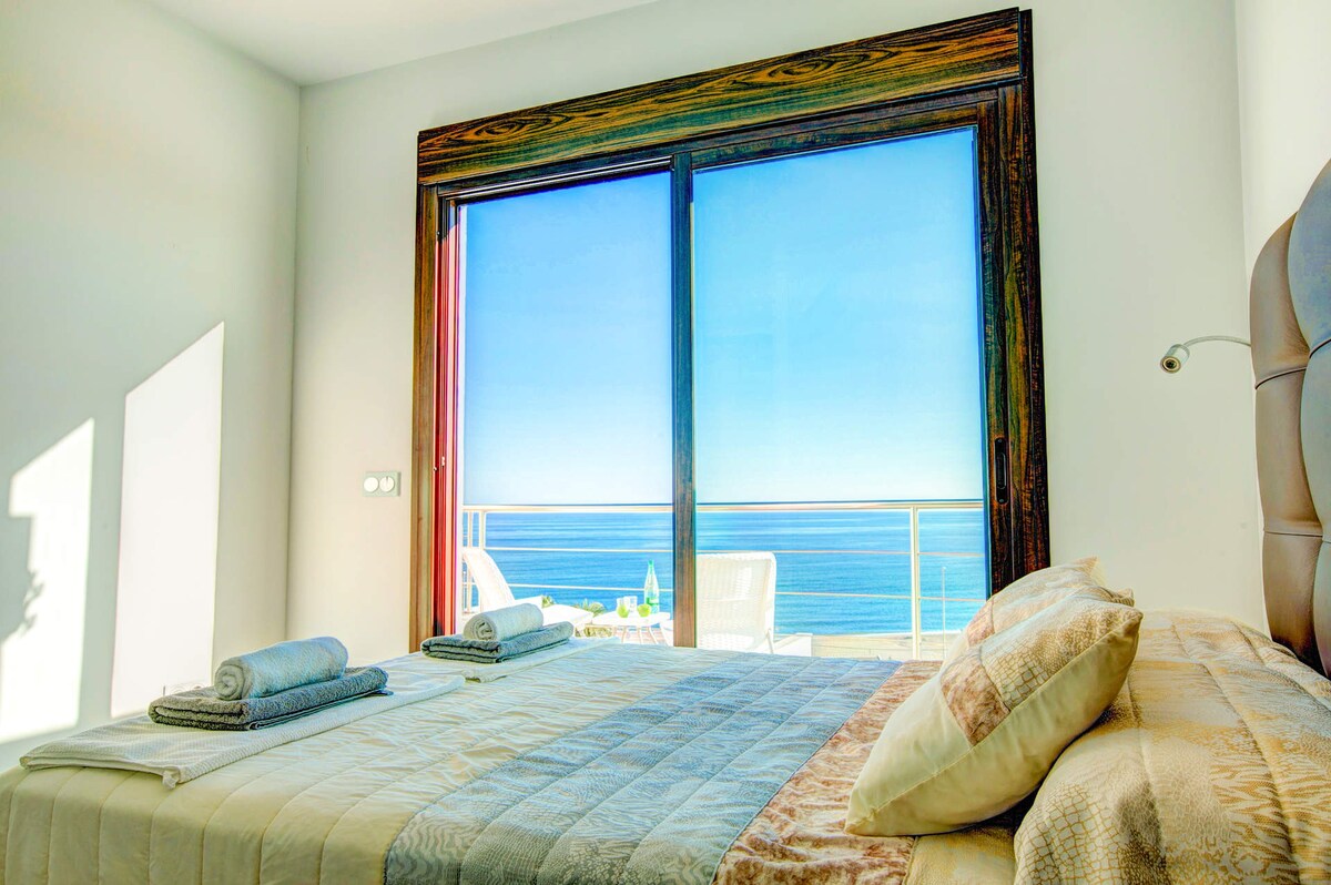 The sea-facing rooms provide a unique experience where you can wake up to stunning sea views. The villa consists of 4 bedrooms, with three double beds located on the upper floor and two single beds on the ground floor, offering ample space for up to 8 guests. There are also two magnificent bathrooms with large showers, a contemporary living room that includes a dining area and large sliding glass doors that open onto the main terrace, as well as a fully equipped kitchen with breakfast bar.