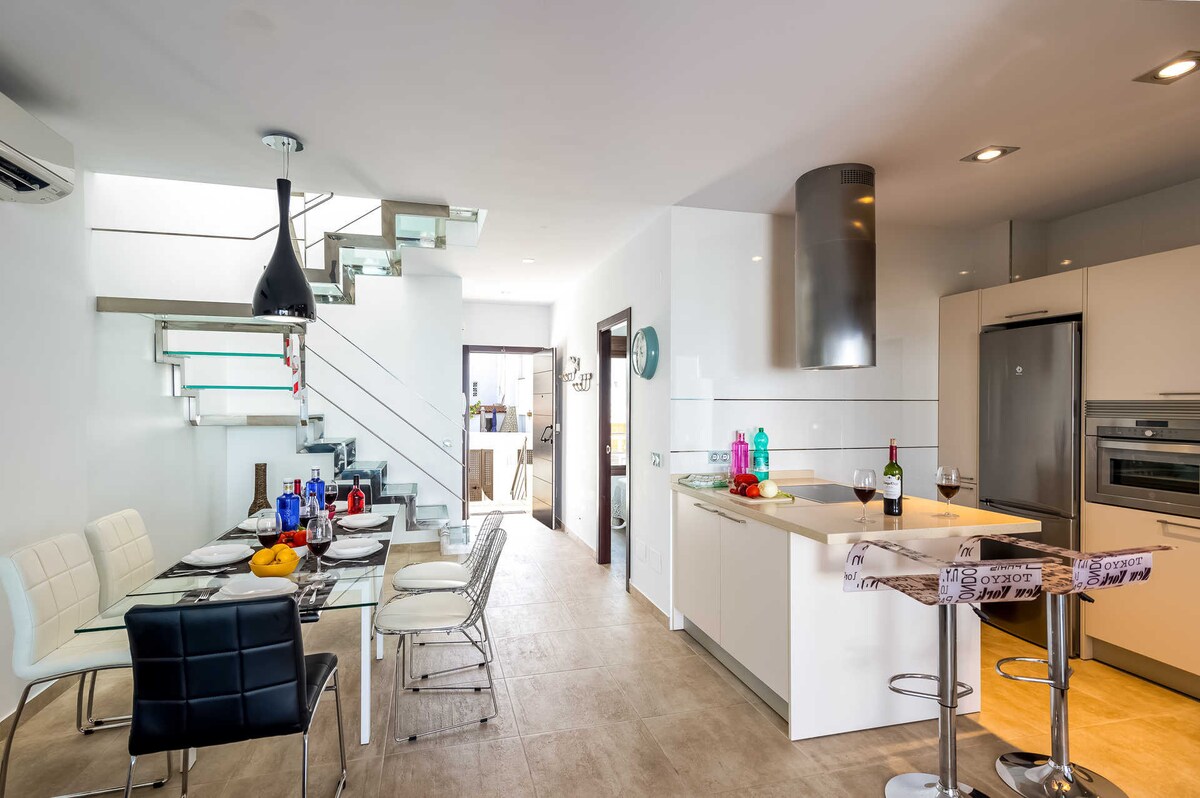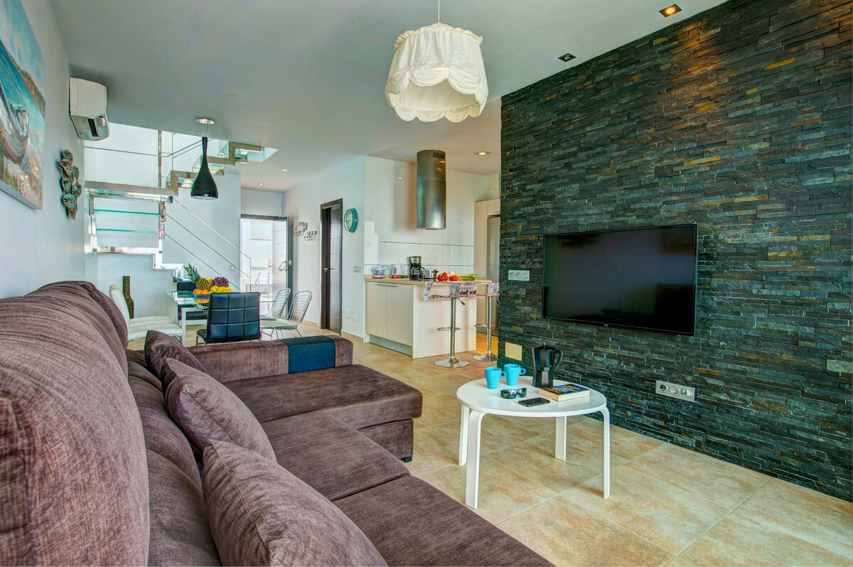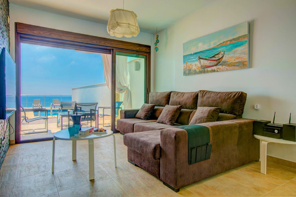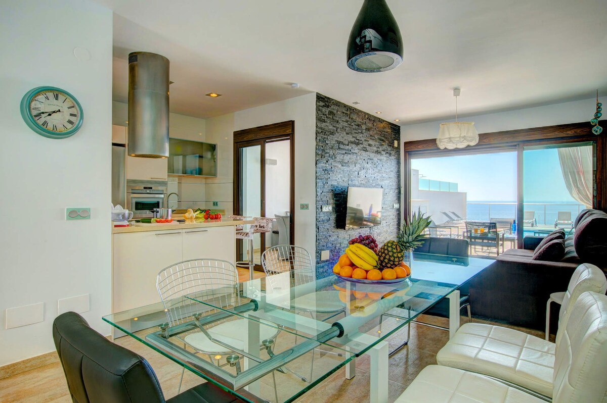 The villa is air-conditioned and comes with everything you need for an unforgettable holiday. Enjoy uninterrupted sea views, as there is nothing to obstruct them, and the beach and nearby chiringuitos and restaurants are a short 200 metre walk away.