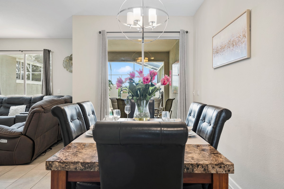 Share meals in the dedicated dining area, equipped with a spacious table and comfortable seating. This is the perfect spot for gathering, whether enjoying breakfast or winding down with dinner after a day at the parks.