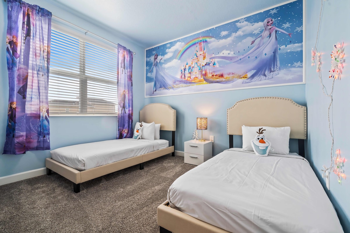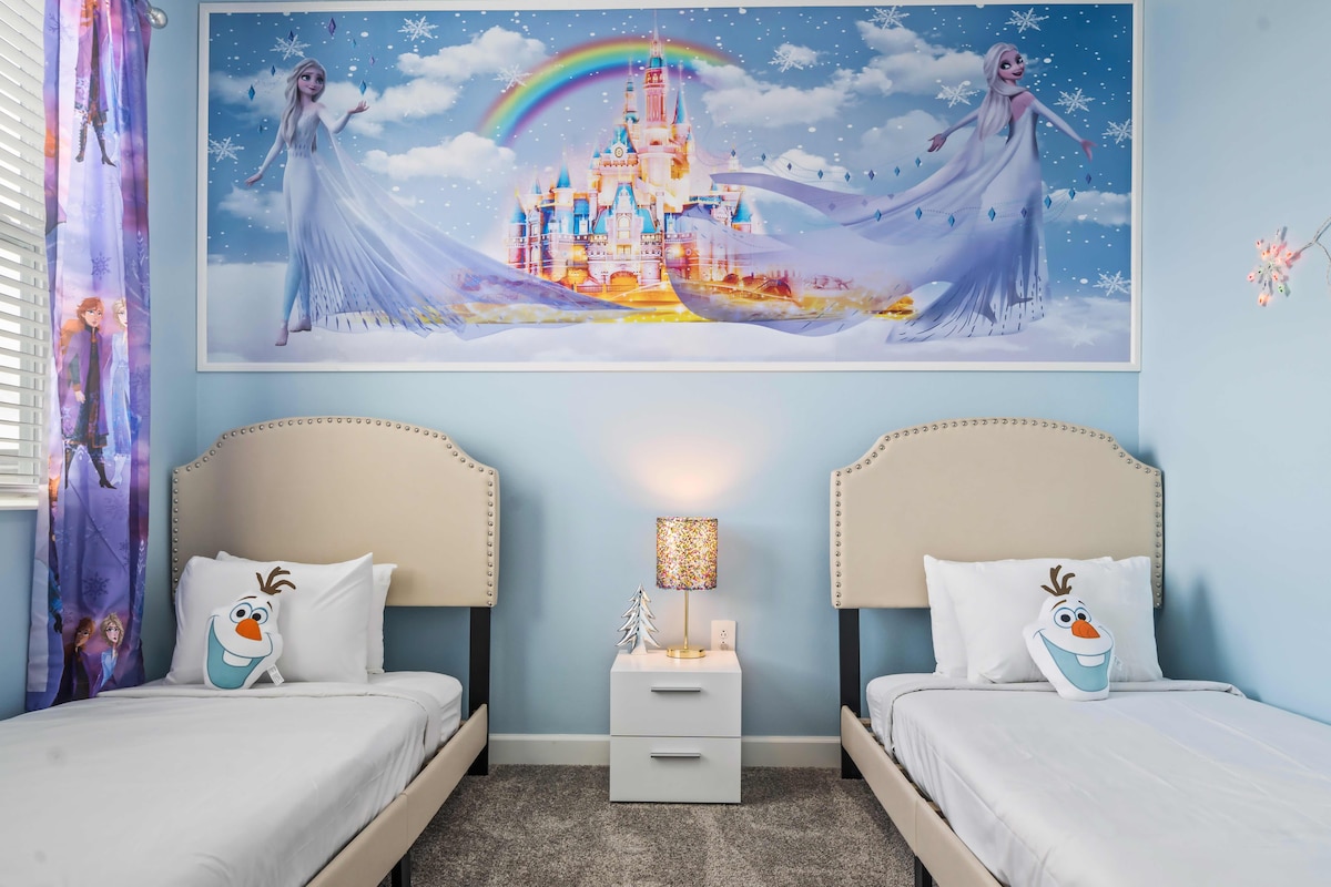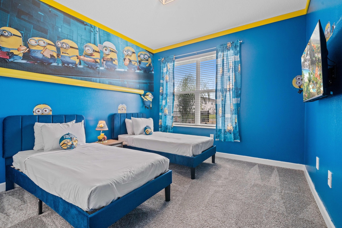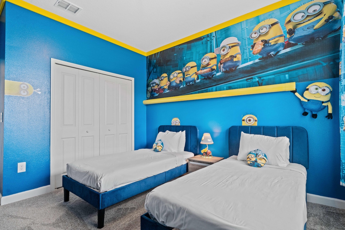 Each of the five bedrooms is thoughtfully designed with a unique theme to create a fun and memorable stay for guests of all ages. From Minions-themed rooms for kids to Frozen-inspired décor, each space is perfect for both rest and play. The home accommodates up to 10 guests, ensuring everyone has a comfortable, spacious bedroom to unwind after a day of adventures.