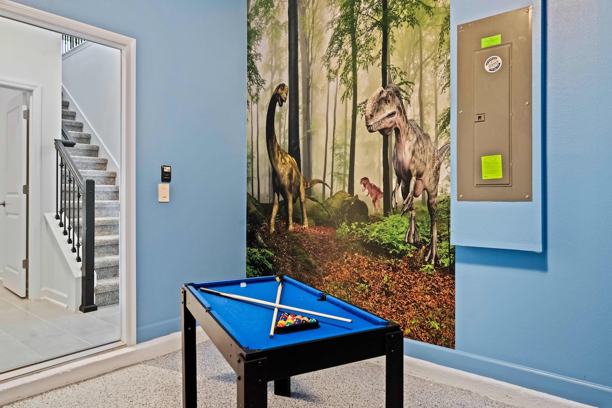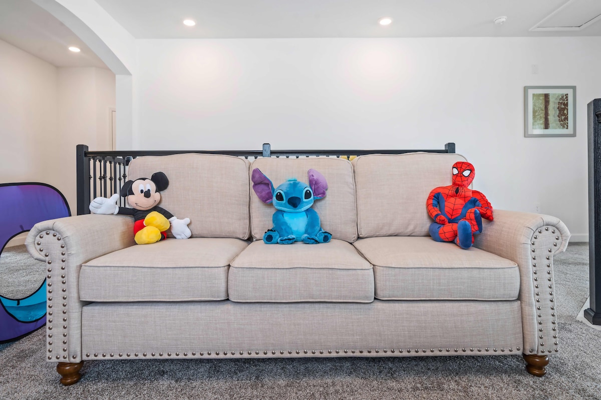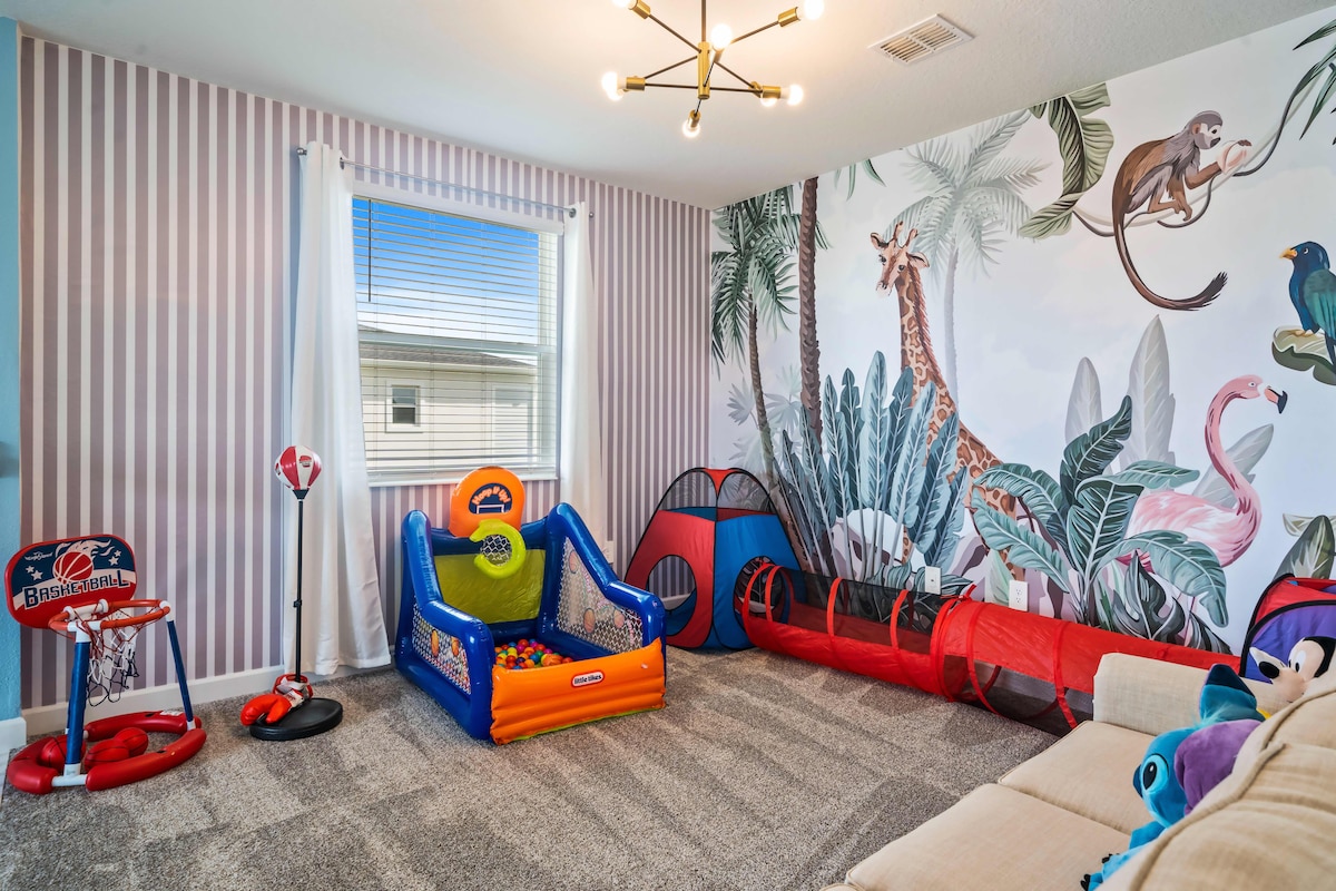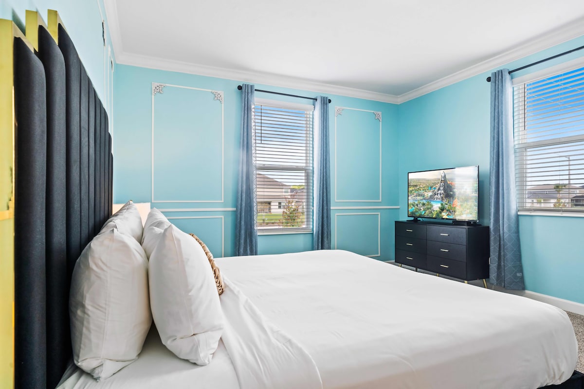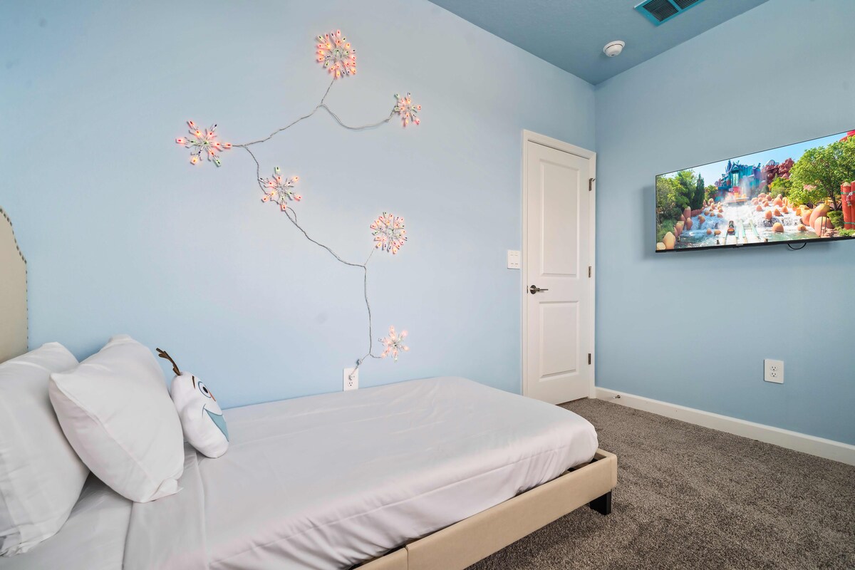 Each of the five bedrooms is thoughtfully designed with a unique theme to create a fun and memorable stay for guests of all ages. From Minions-themed rooms for kids to Frozen-inspired décor, each space is perfect for both rest and play. The home accommodates up to 10 guests, ensuring everyone has a comfortable, spacious bedroom to unwind after a day of adventures.