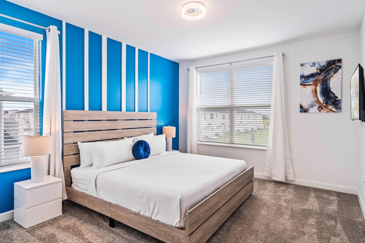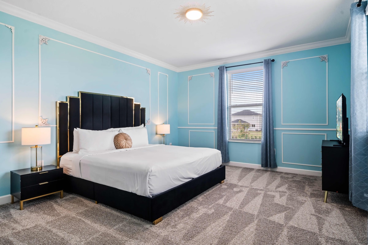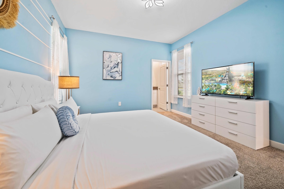 Two luxurious master suites provide a tranquil escape for adults. These rooms are elegantly decorated with soothing tones and offer full access to smart TVs for entertainment. Each suite features ensuite bathrooms with modern walk-in showers and spa-like amenities, offering a peaceful retreat after a day of excitement at the theme parks.