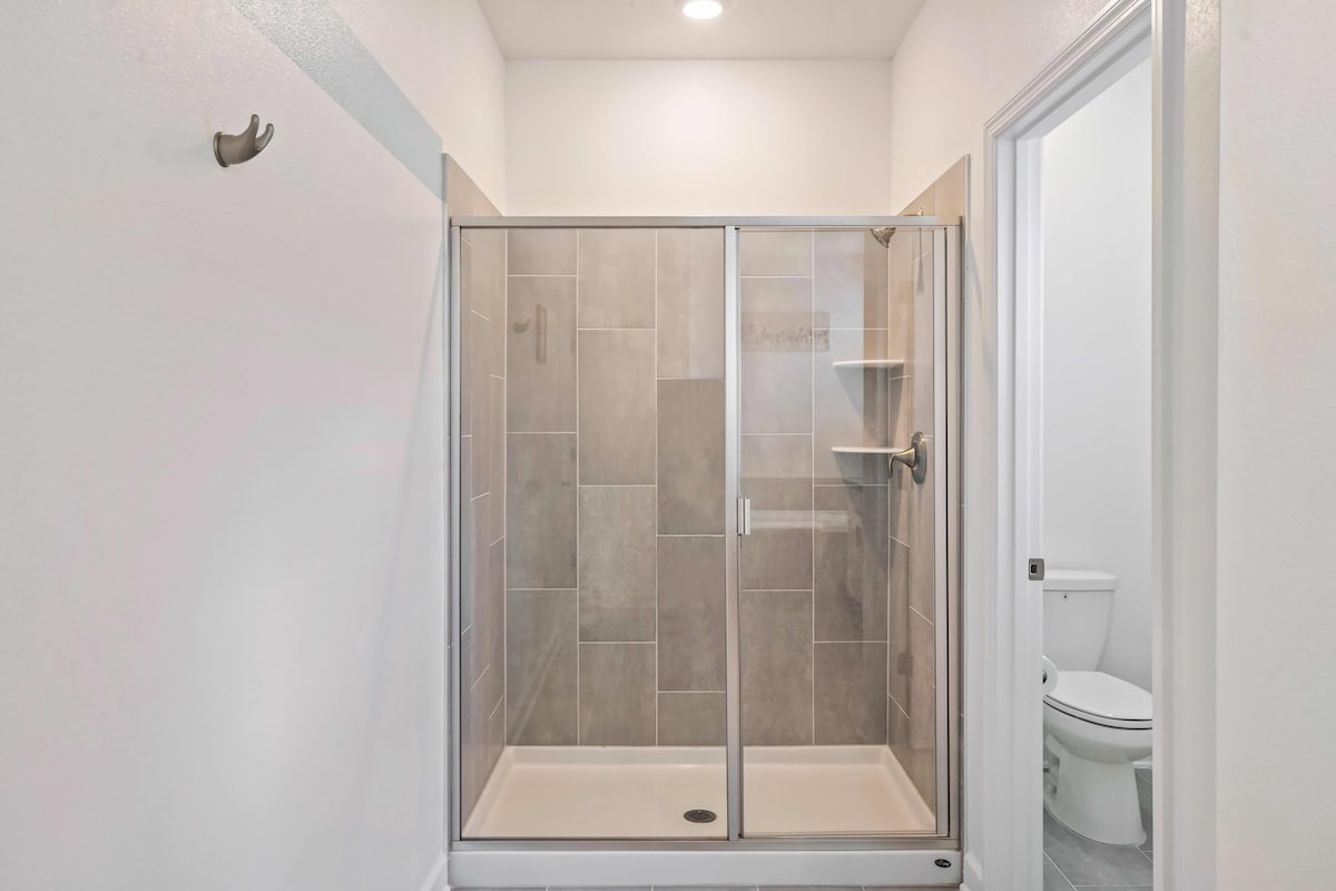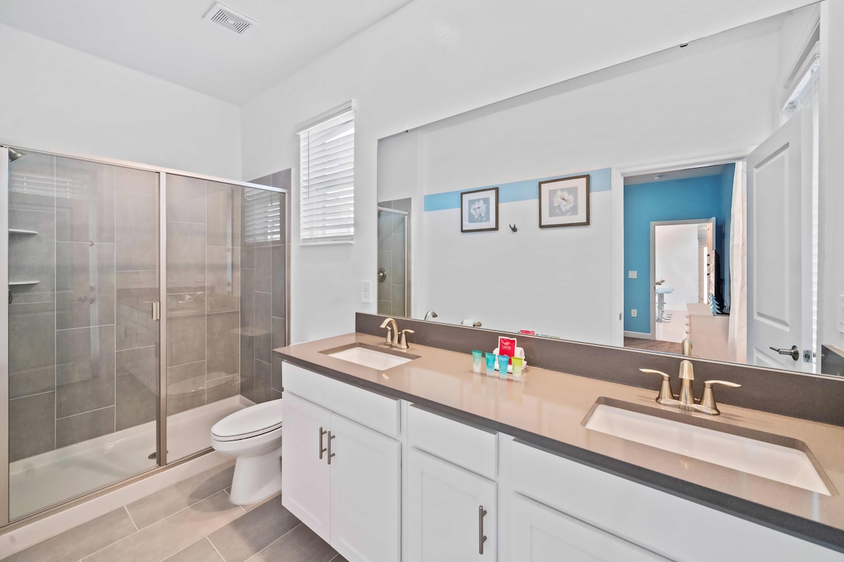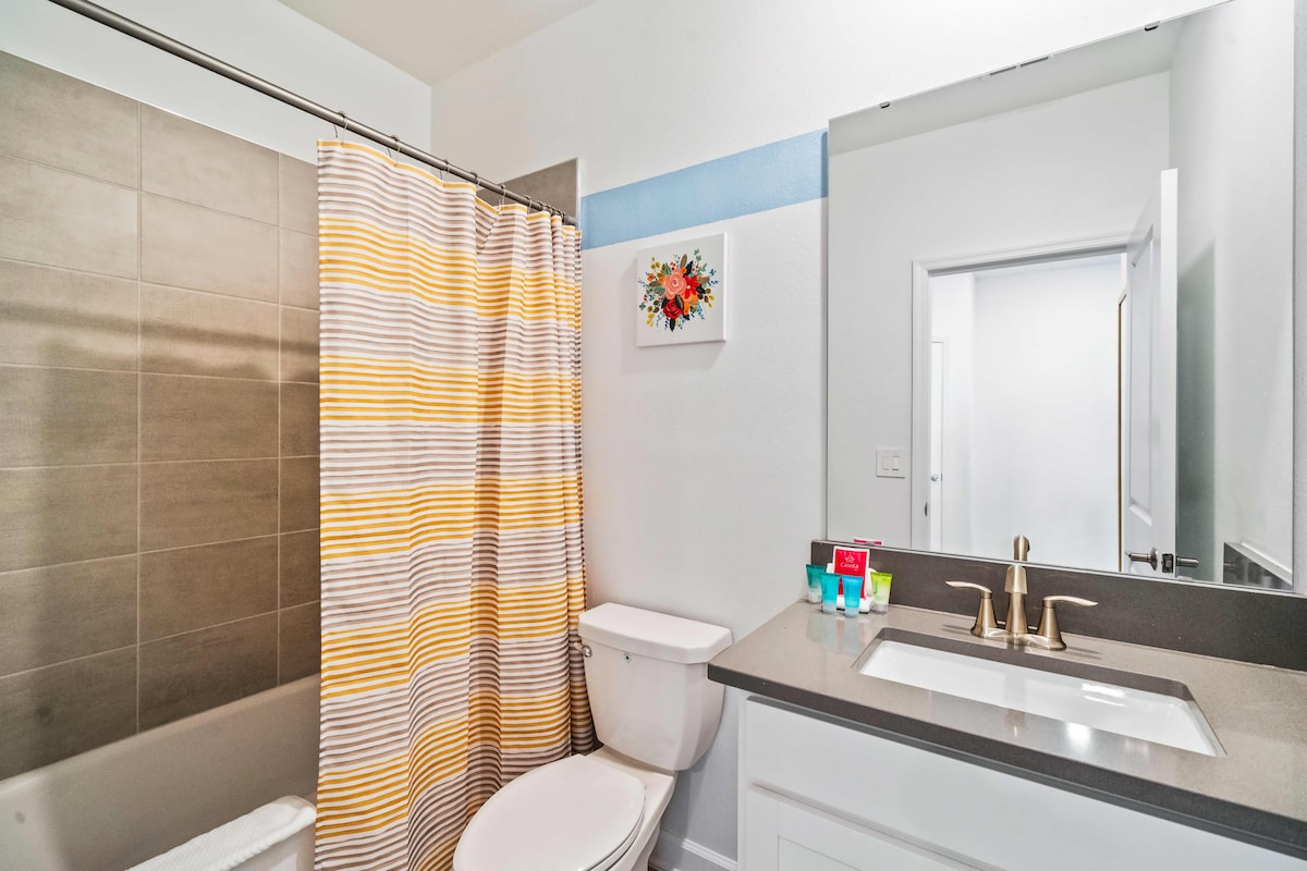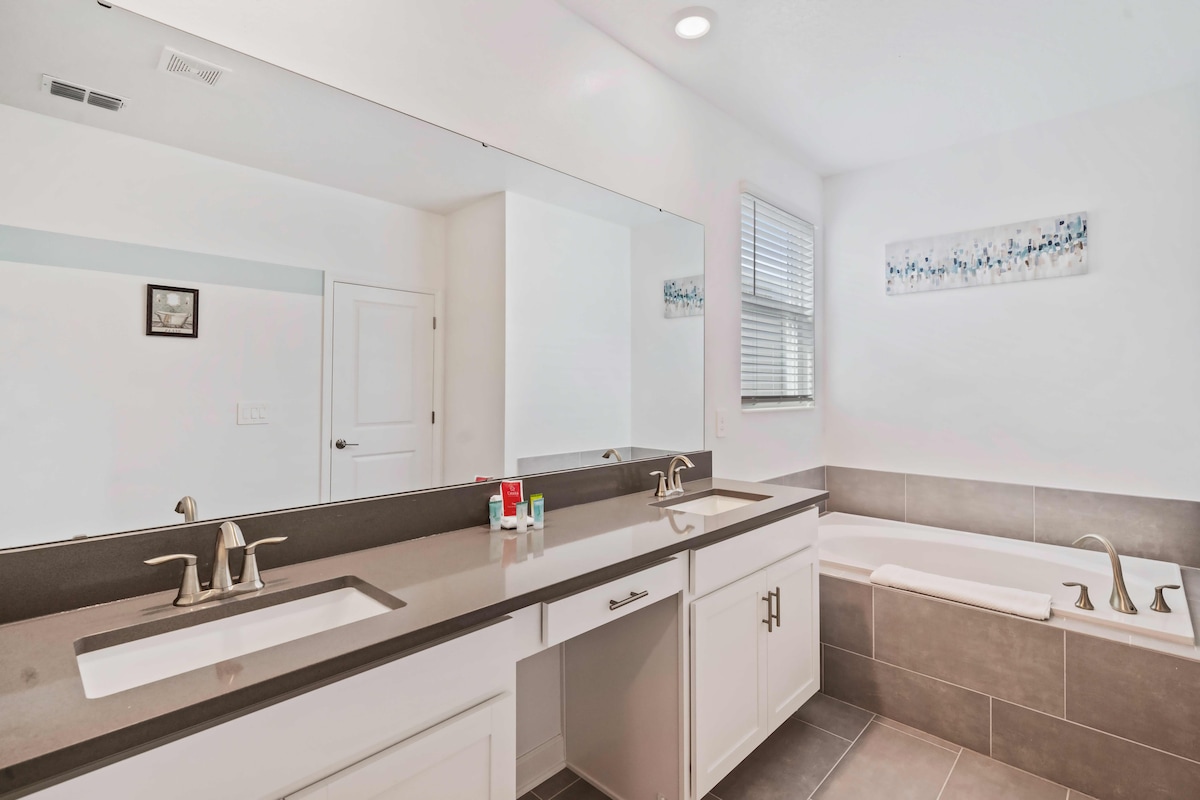 Two luxurious master suites provide a tranquil escape for adults. These rooms are elegantly decorated with soothing tones and offer full access to smart TVs for entertainment. Each suite features ensuite bathrooms with modern walk-in showers and spa-like amenities, offering a peaceful retreat after a day of excitement at the theme parks.
