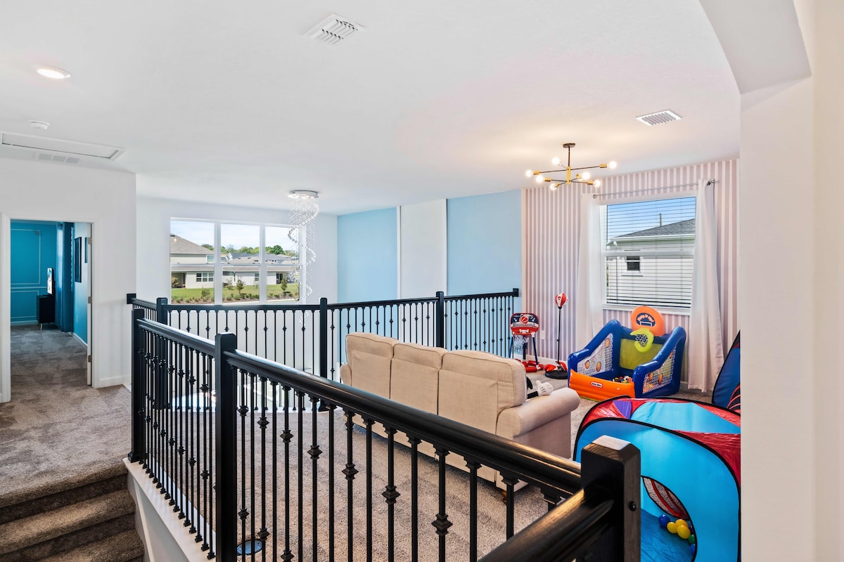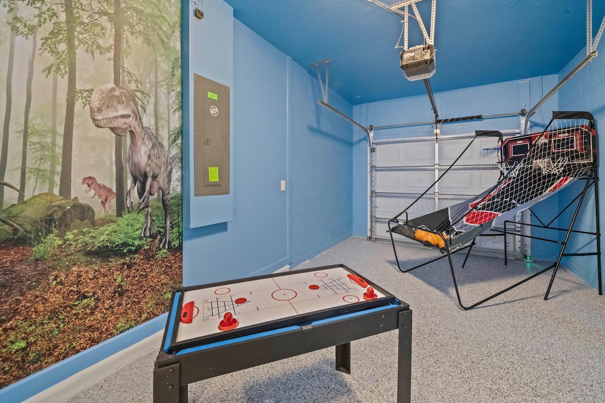 The entertainment options in this home are endless. The second-floor loft is a hub of activity with arcade games and board games, ensuring hours of fun for children and adults alike. The game room, featuring an air hockey table and a basketball arcade game, is perfect for competitive fun with friends and family, creating moments of laughter and joy during your stay.