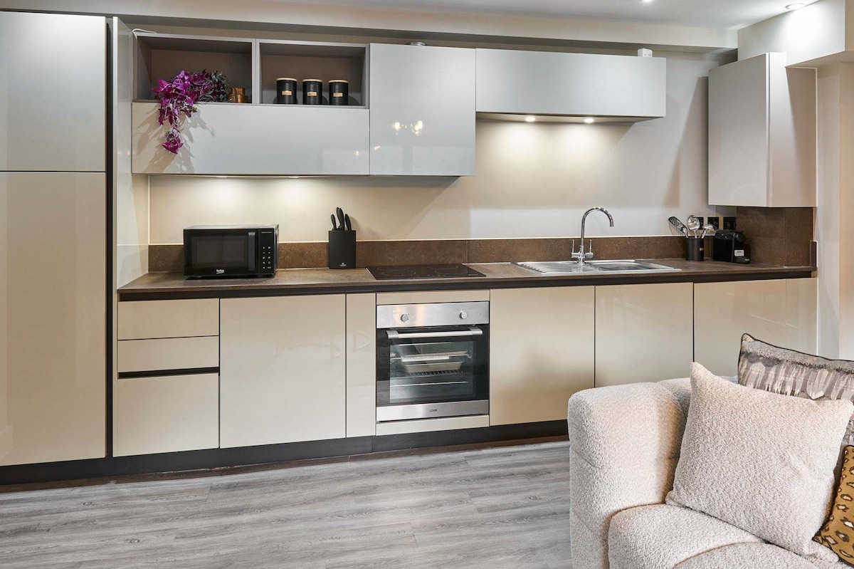 This space is also home to the modern kitchen, fully equipped for cooking at home, with a fridge/freezer, hob, oven, microwave, toaster, and more. A washing machine is also provided for your convenience.
