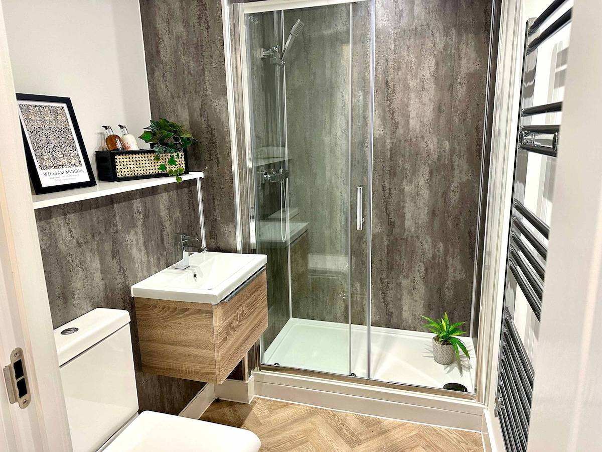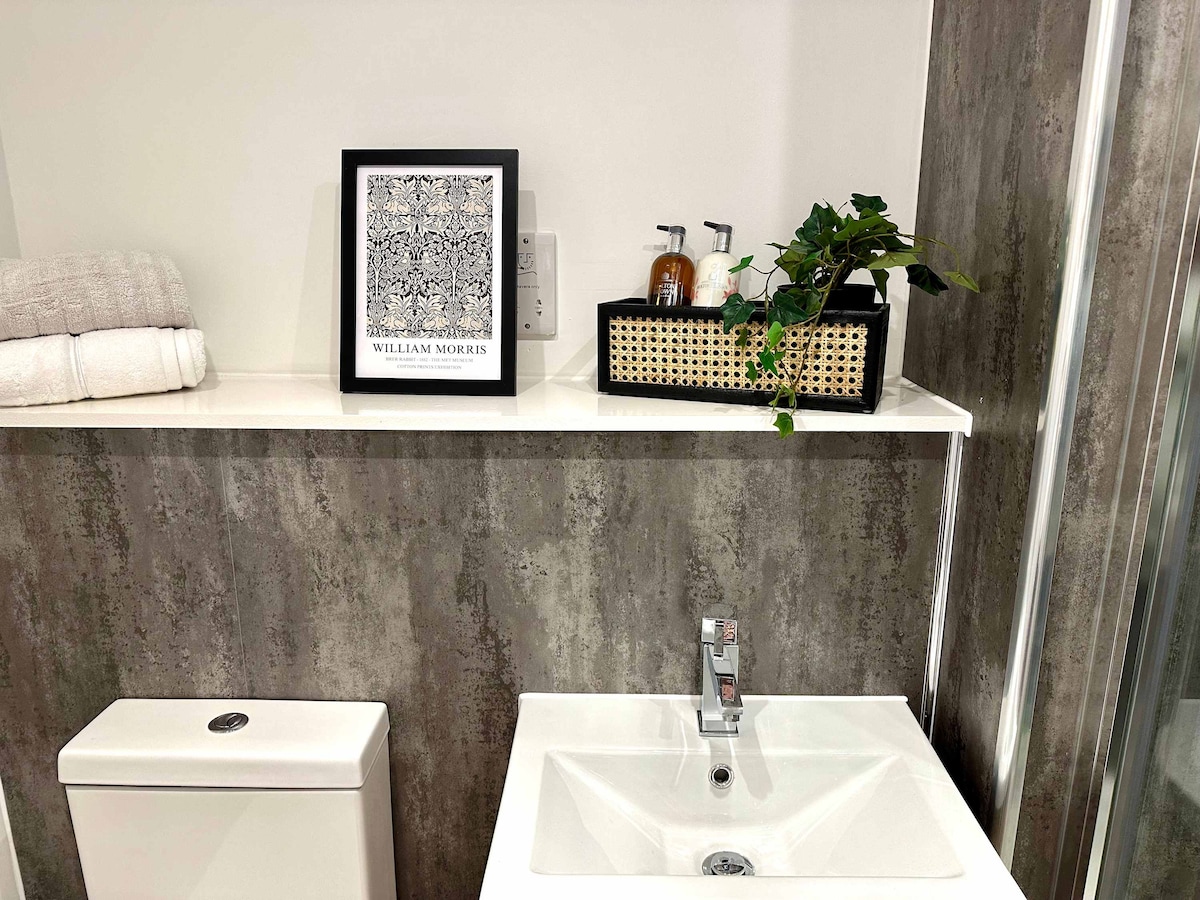 Copper Box also offers a modern family bathroom with a shower cubicle, WC, and wash basin, all designed to a high standard.
