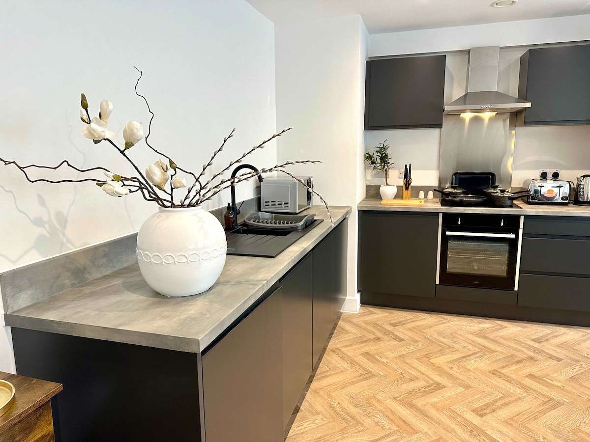 The kitchen is fully equipped with everything you need for a home away from home, including an electric hob and oven, toaster, kettle, fridge/freezer, microwave, and more.