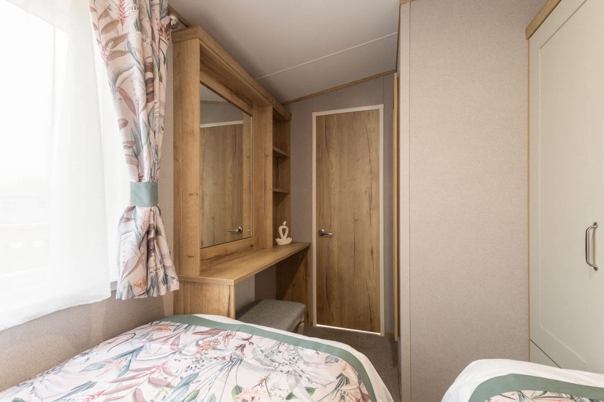 The cosy master bedroom has a comfortable king-size bed and premium linens. With ample storage space and an ensuite shower room, it's the perfect place to relax and make yourself at home. Natural wood accents enhance the room’s calming charm.