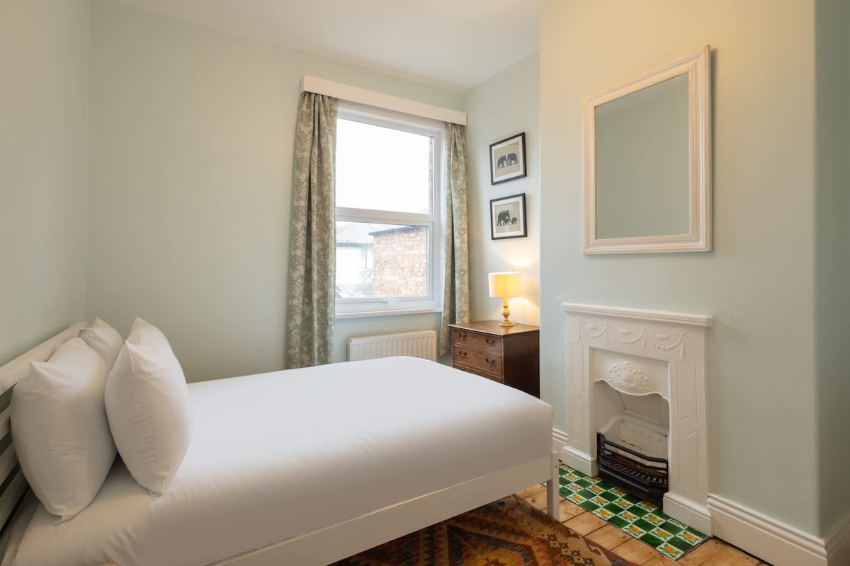The master bedroom features a large king-sized bed and a bay window which allows plenty of natural light to flood into the space. A traditional chair by the window provides the perfect nook for reading or simply taking in the scenery. Ample storage is available with plenty of room for hanging clothes and a chest of drawers, ideal for guests who don’t pack light!