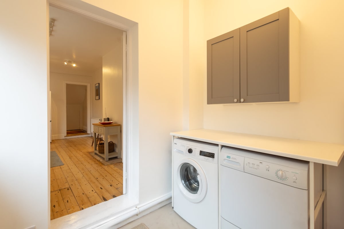The shaker style, cream cabinets and ample countertop space make this kitchen a joy to cook in. Equipped with modern appliances and stocked with essentials like tea, coffee, and sugar, the kitchen has everything you should need. Enjoy a good cup of coffee from the provided coffee machine (please note that coffee pods are not included). A dishwasher and washing machine are also provided in the neighbouring utility room for added convenience.