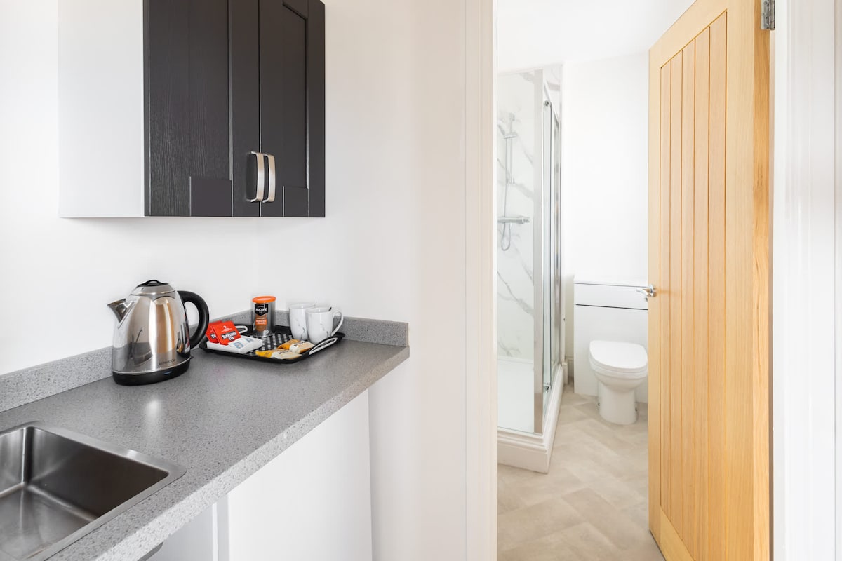 The refreshment area has a microwave, kettle, sink and fridge, while the En-suite shower room comes with a large shower, WC and wash basin.
