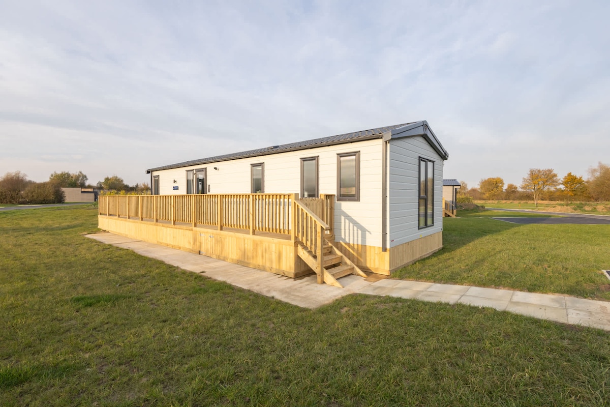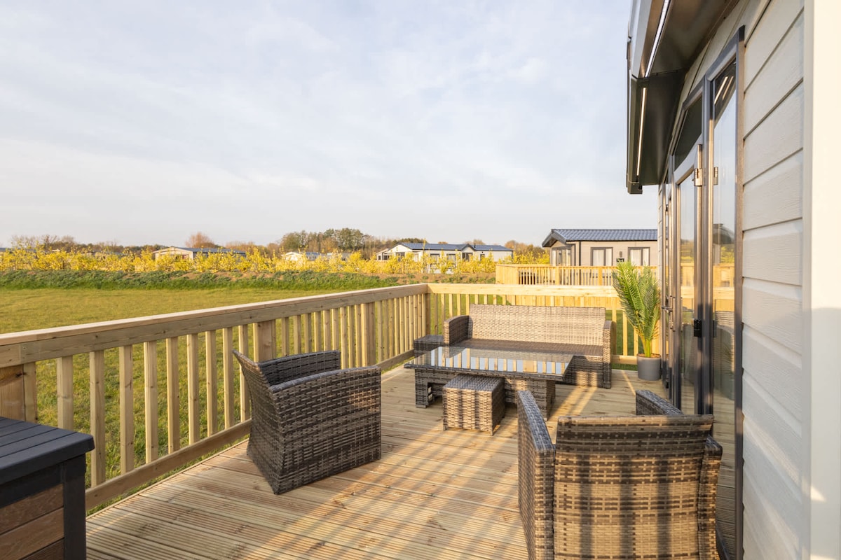 This beautiful, dog friendly lodge offers an ideal rural retreat with stunning countryside views, spacious interiors, and convenient on-site parking.The spacious living room is thoughtfully divided into zones for dining, lounging, and cooking. The dining table, which seats all guests, is perfect for shared meals. The lounge area includes two comfortable sofas and a footstool with a peaceful outlook from the large windows. There is plenty of space to relax with a book and a cup of tea, or listen to music the Bluetooth speaker.