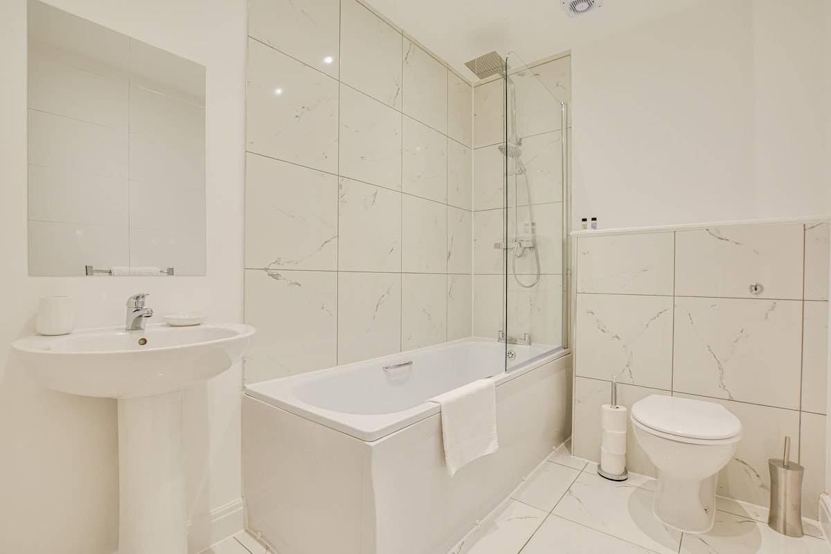 The main family bathroom features a modern design with a bathtub, shower, WC, and wash basin. One of the bedrooms is also home to an ensuite shower room.