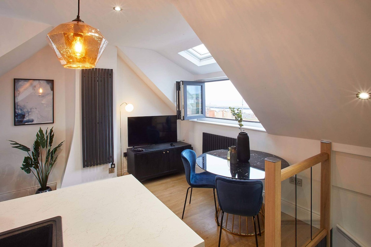 A hidden gem. A modern cosy space with theee best view from the bifold window. Pull up the bar stools and watch the sunshine and night sky across the rooftops. All amenities and a great cooking space. Crisp fresh bedding and fluffy large bath sheets. A great base for our 12 mile walk from Staithes back to Whitby. X4 bus is half hourly up the coast. 5 minute walk from the flat.