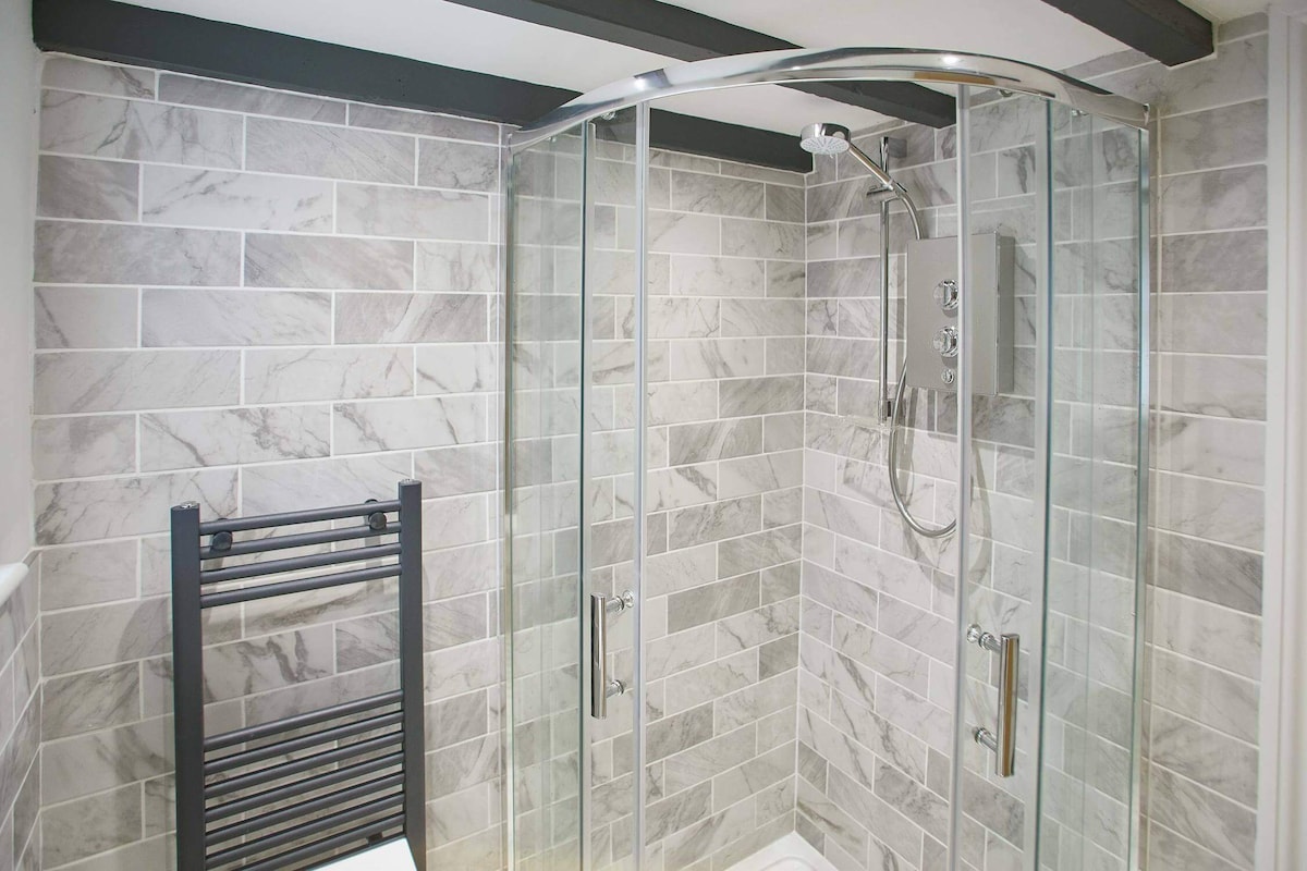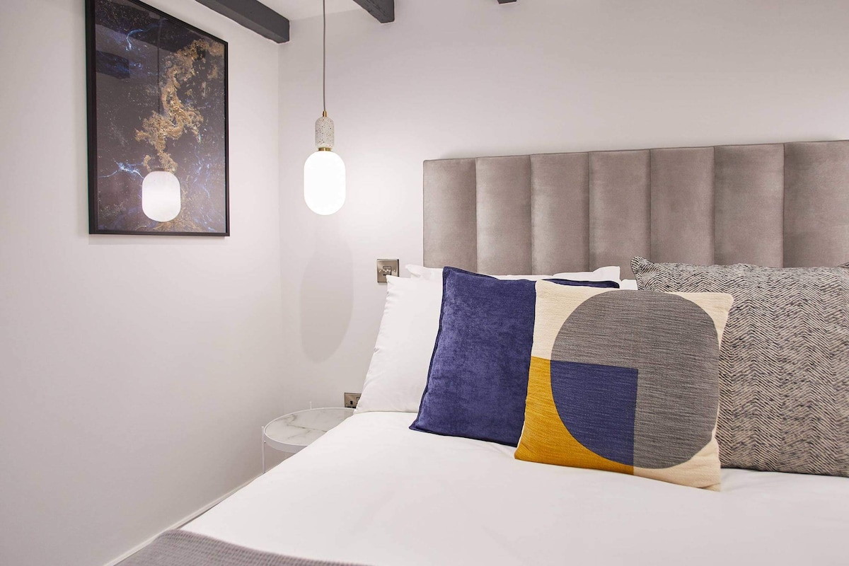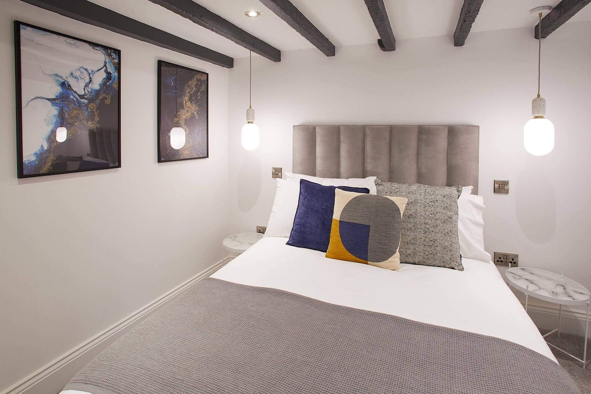 Burns Yard has style and class in abundance. This quirky holiday home is based across three floors and you’ll be wowed by the modern interiors.As you walk into the hallway, head straight up the stairs and you’ll find the bedroom and bathroom on the first floor. The bedroom is a clean and bright space featuring a large, extravagant bed and contemporary lights which hang above marble bedside tables. Dark wooden beams contrast perfectly with the white walls and grey colour scheme. A floor length gold mirror and blue suede chair complete the room and add even more glamour.