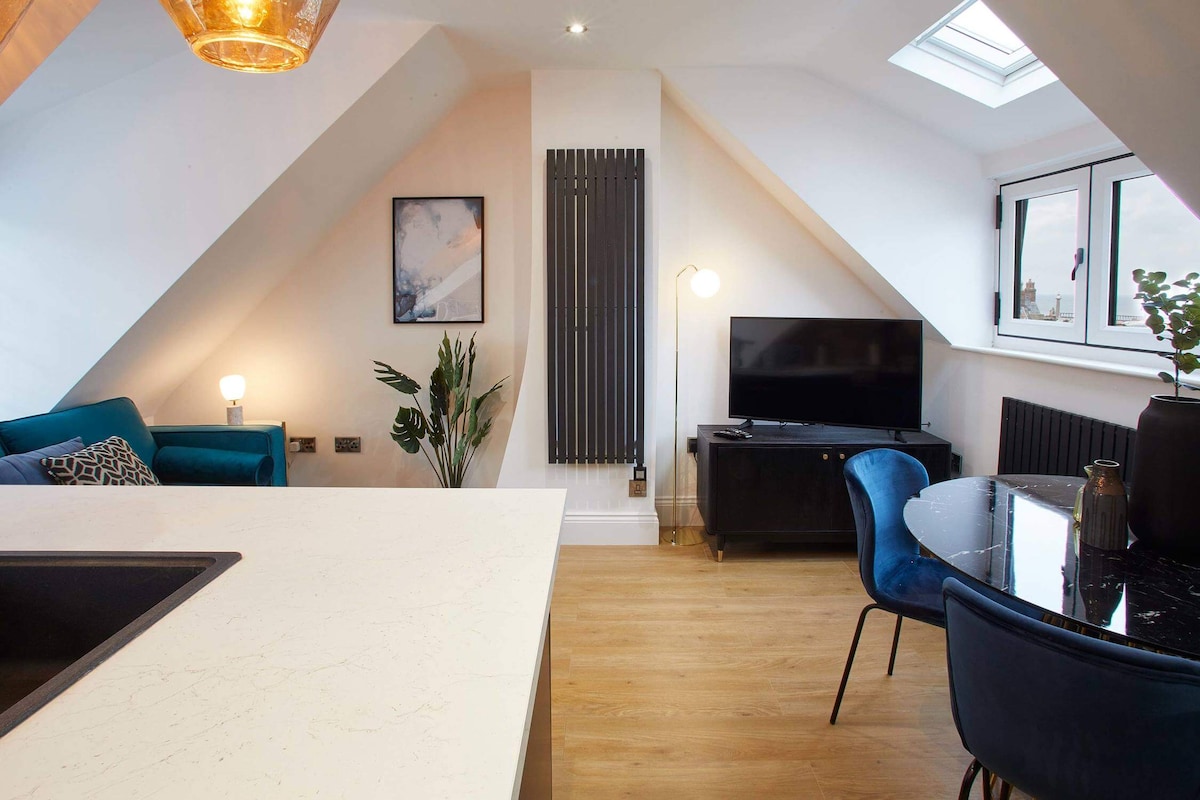 Head up the stairs again to the second floor and you’ll discover the open plan kitchen and living area. Wow! With sloping ceilings and breath-taking views of Whitby and the Abbey, this space is very impressive. The dark blue kitchen creates a cosy feel which contrasts beautifully with the clean, white walls. You’ll have everything you need for your stay as the kitchen is equipped with an oven, hob, microwave, toaster, kettle, fridge and dishwasher.