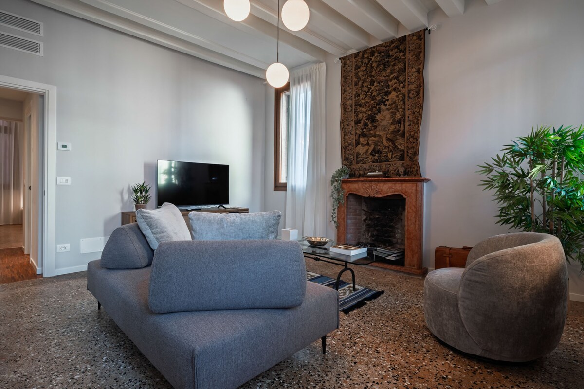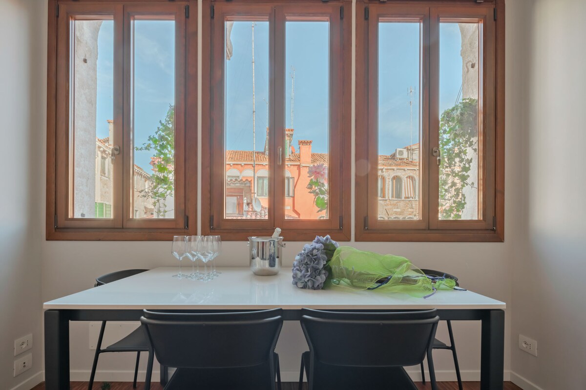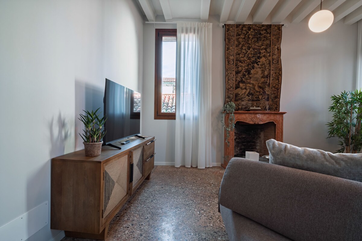 Located on the second piano nobile of the palazzetto, this charming apartment features a welcoming living area, a fully equipped kitchen, and two bedrooms, one with a double bed and the other with an extra-large single bed. The kitchen boasts a beautiful trifora, a quintessential Venetian architectural feature, offering guests an authentic and unforgettable experience.