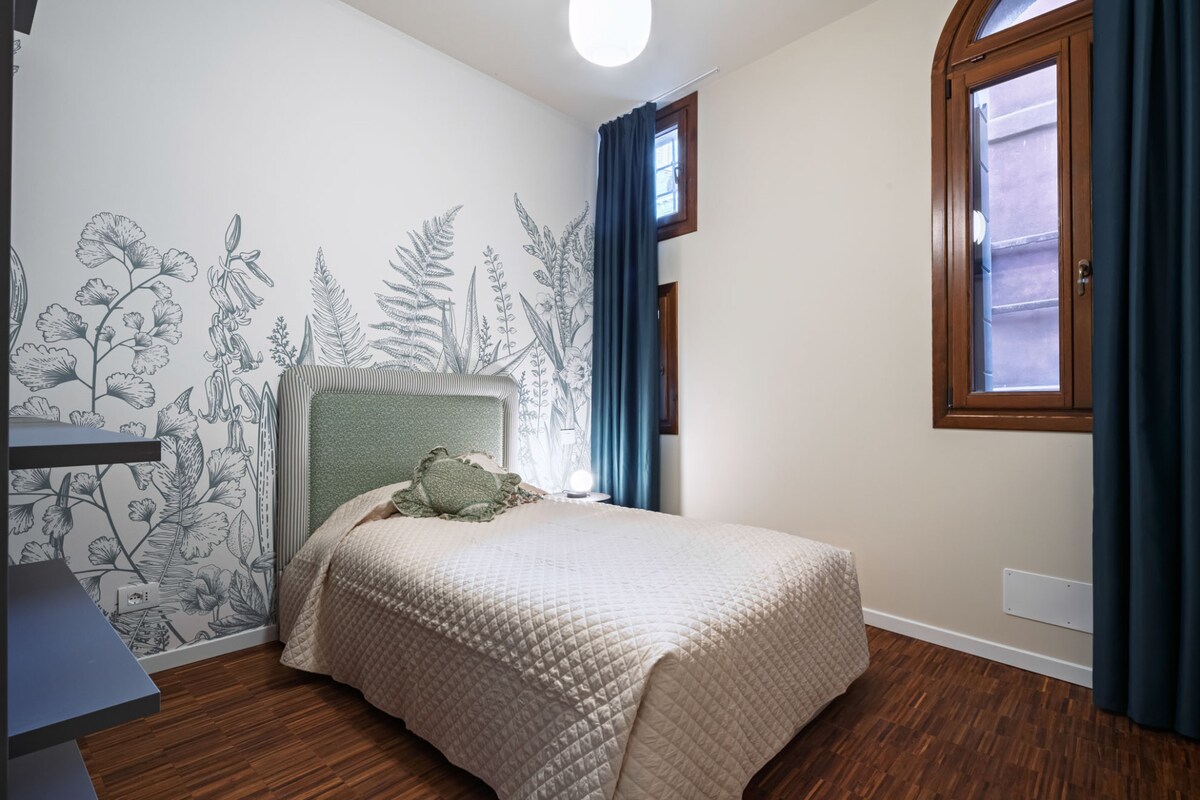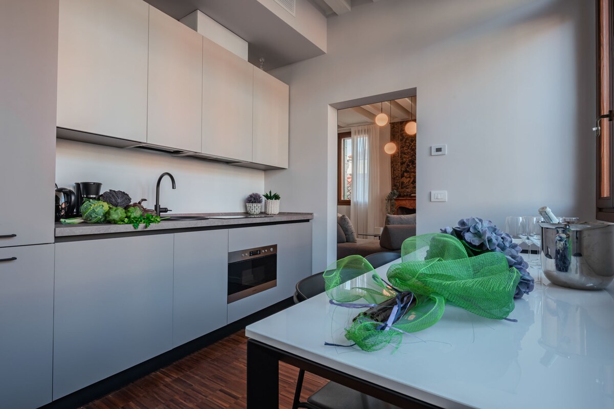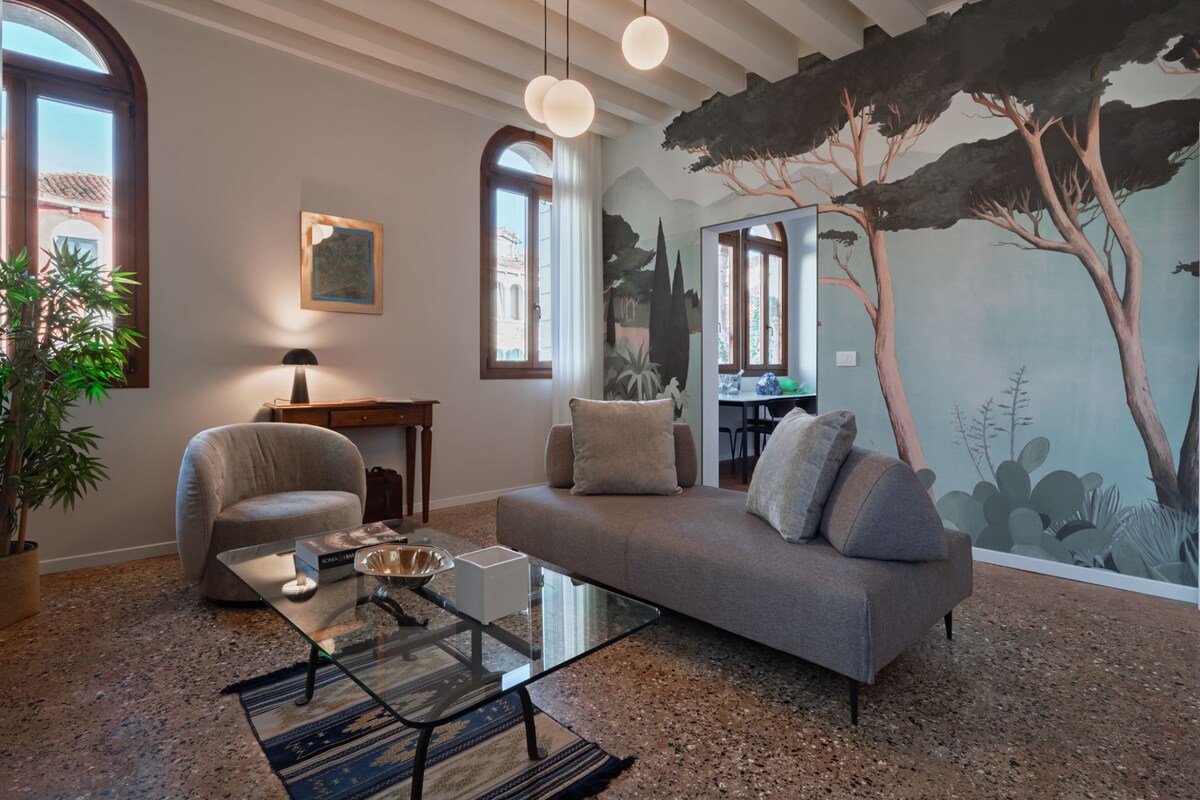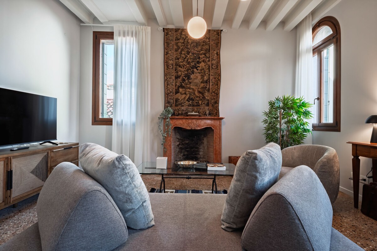 Located on the second piano nobile of the palazzetto, this charming apartment features a welcoming living area, a fully equipped kitchen, and two bedrooms, one with a double bed and the other with an extra-large single bed. The kitchen boasts a beautiful trifora, a quintessential Venetian architectural feature, offering guests an authentic and unforgettable experience.