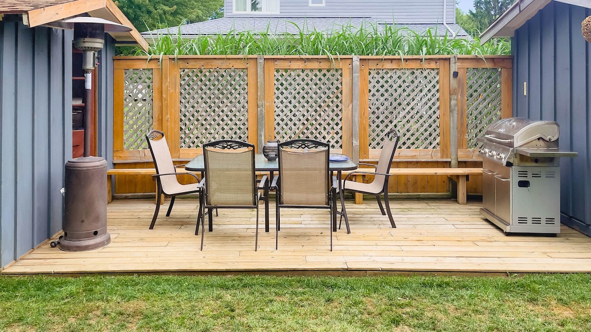Share BBQ delights on the Propane BBQ complete with bistro lights and a propane heater for chillier nights. Open deck seating area and a covered deck if you want to escape the sun.