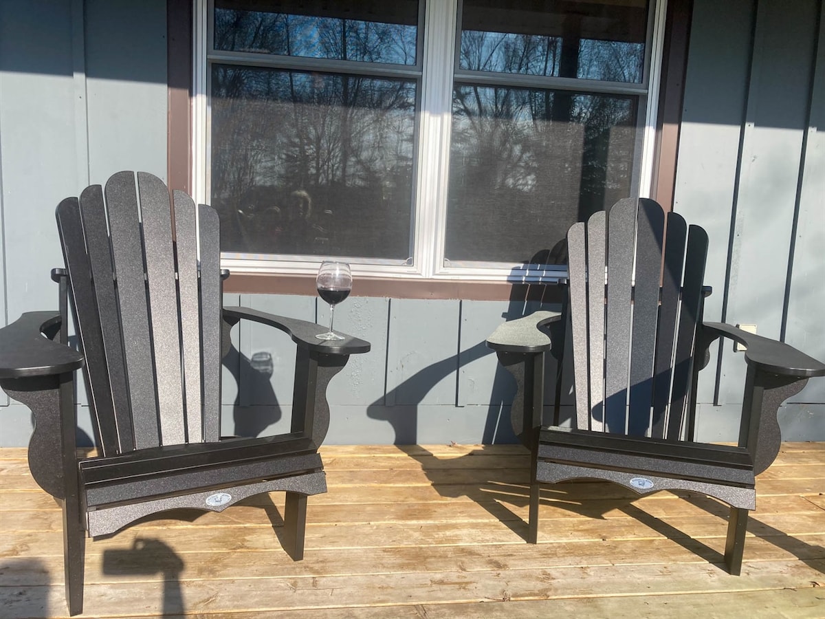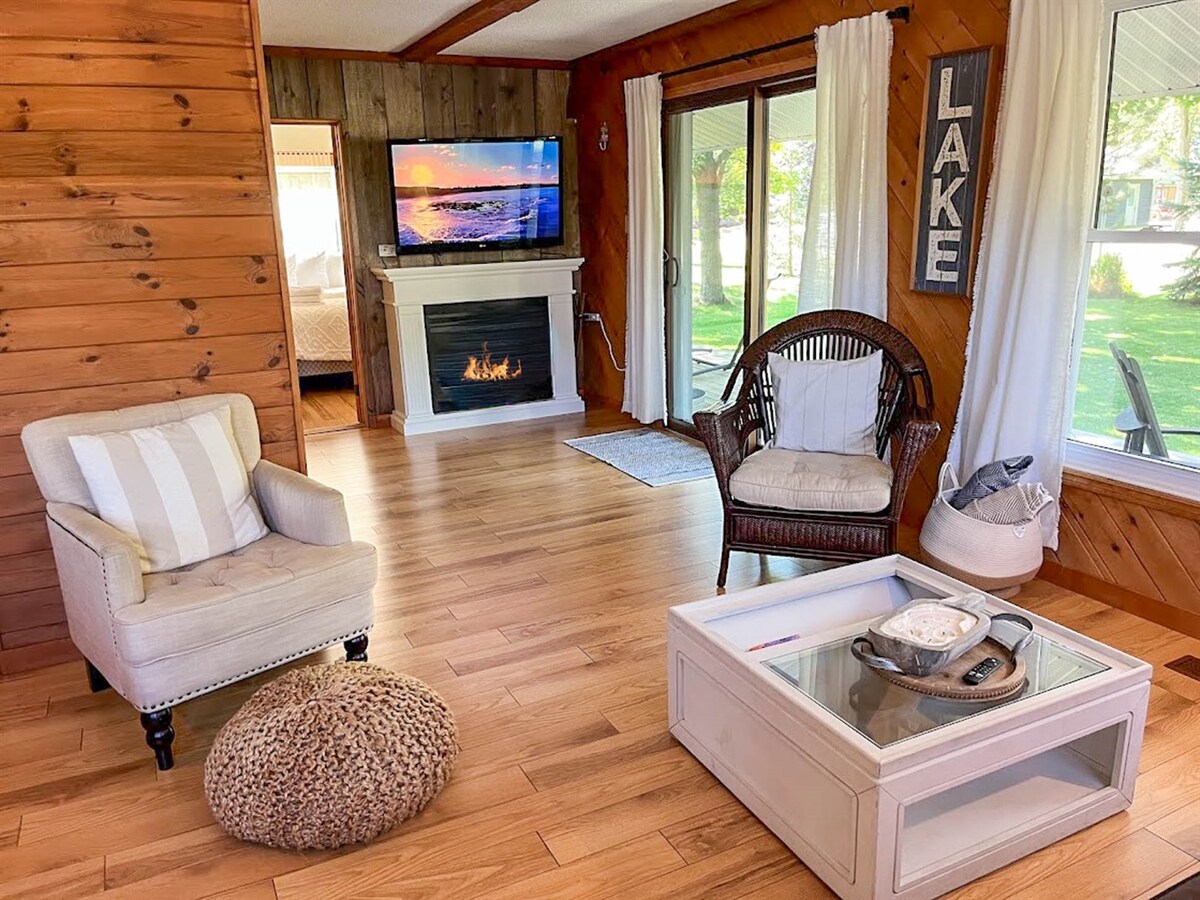 Extras at the cottage include a SmartTV so you can login to your own Netflix/Prime account. Outdoor dining with propane heater. And you can cozy up in front of an electric Fireplace. There are 2 huge floaties for your use and an outside shower!