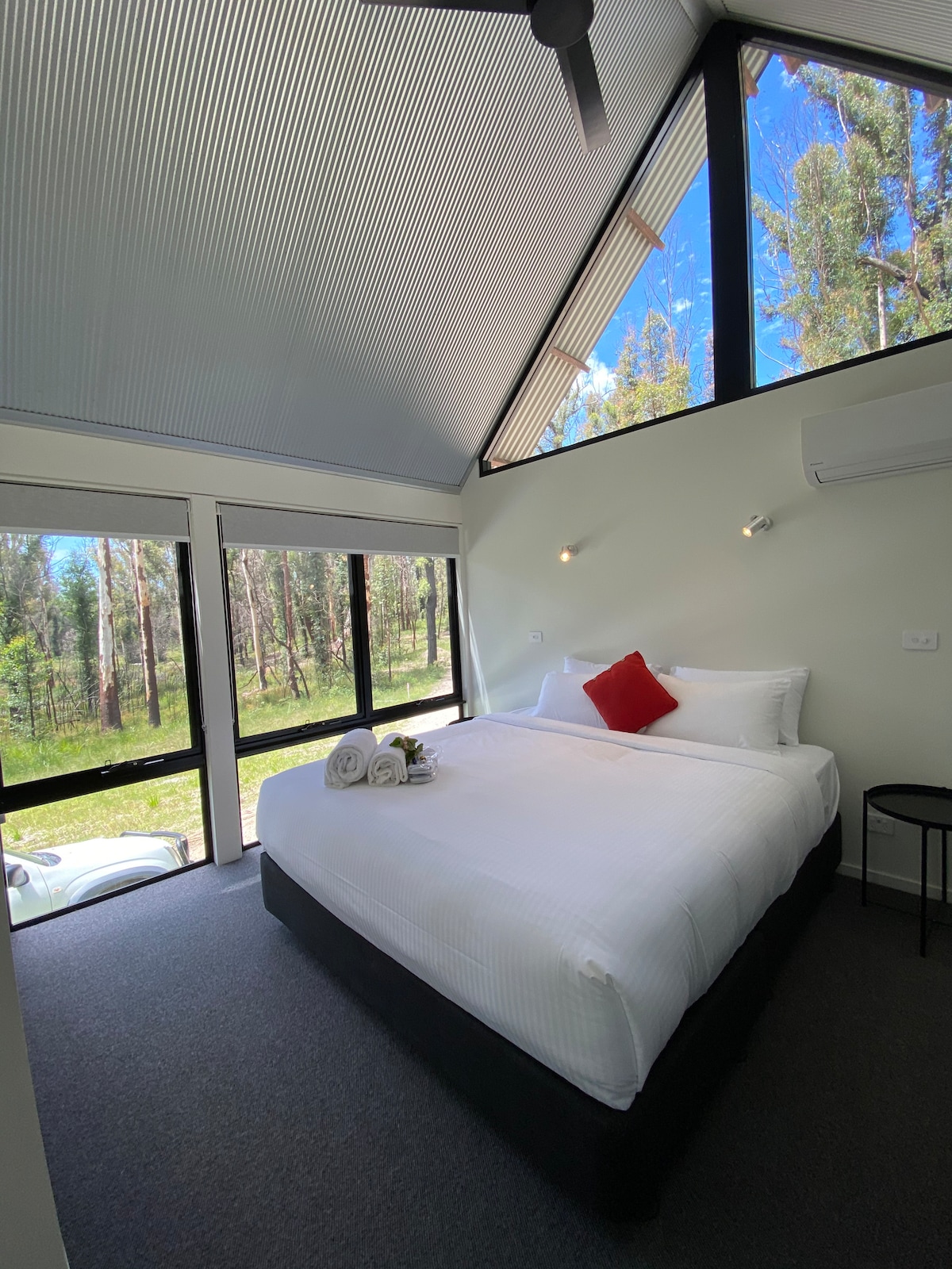 - A **deep double spa bath** with piped music and views into the surrounding bushland — perfect for champagne and stargazing