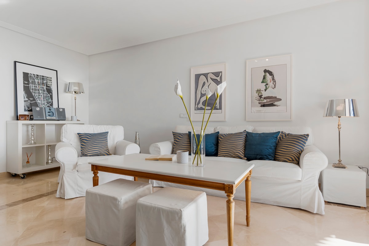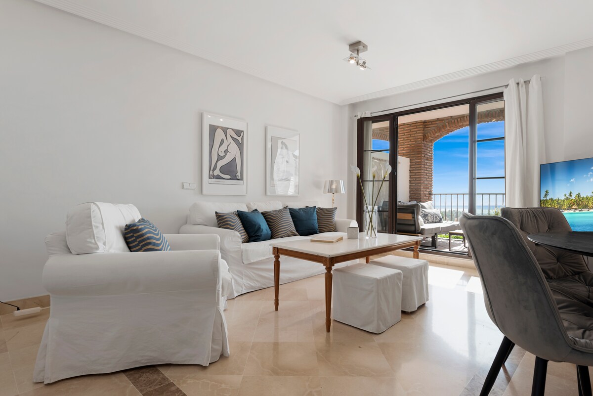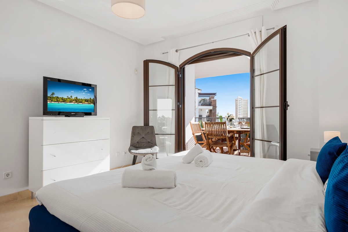 Nestled in the exclusive Los Balcones community within Los Arqueros Golf and Country Club, this bright and elegant 3-bedroom apartment is perfect for golf enthusiasts and vacationers alike. Offering stunning south-facing sea views, the spacious terrace invites relaxation with its chill-out area and outdoor dining table.