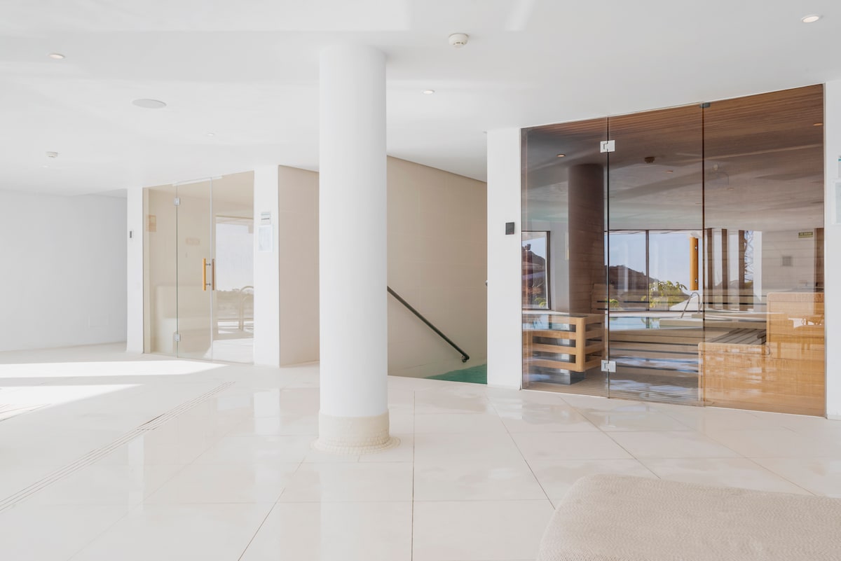 The kitchenette is equipped with dishes, dishes and the main appliances: oven, microwave and dishwasher. The sleeping area consists of 1 double sofa bed in the living area and 2 bedrooms with 2 double beds, and can accommodate up to 6 people. The outdoor space consists of the garden and enriched by an outdoor dining area and solarium. Hillside flat with pool in Palo Alto - Ref M49 also has: sauna, Turkish bath, gym and television.Pools have very different opening times, please inquire before the booking to make sure the pool is open during your stay.