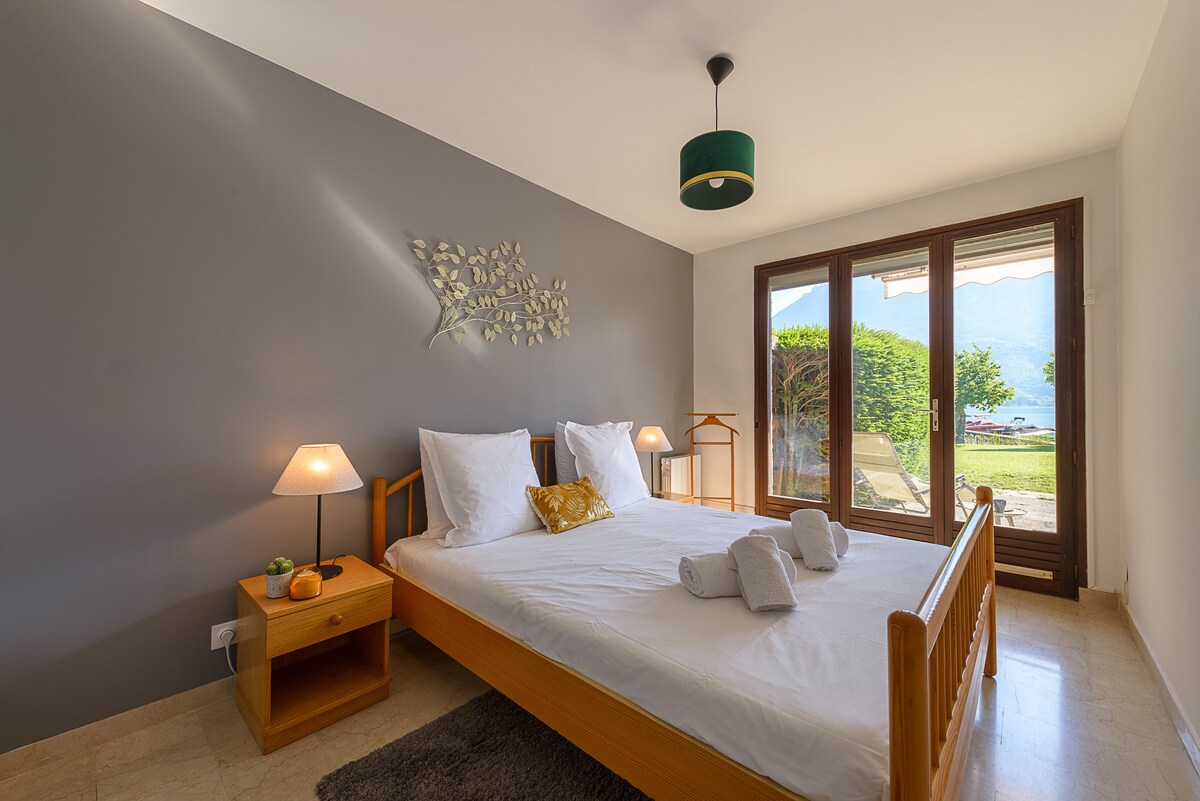 - Bedroom n°1: Double bed with 2 x 80x190cm mattresses next to eachother, with direct access to the terrace/garden and lake