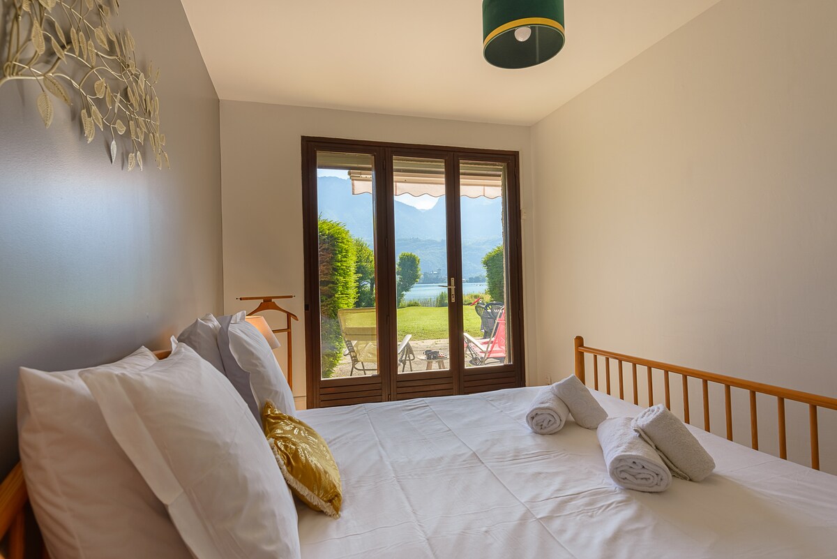 - Bedroom n°1: Double bed with 2 x 80x190cm mattresses (can be made into a double bed or 2 adjoining single beds) ) with direct access to the terrace/garden and lake