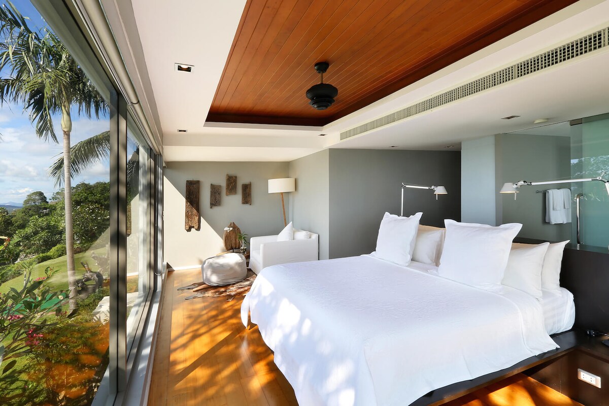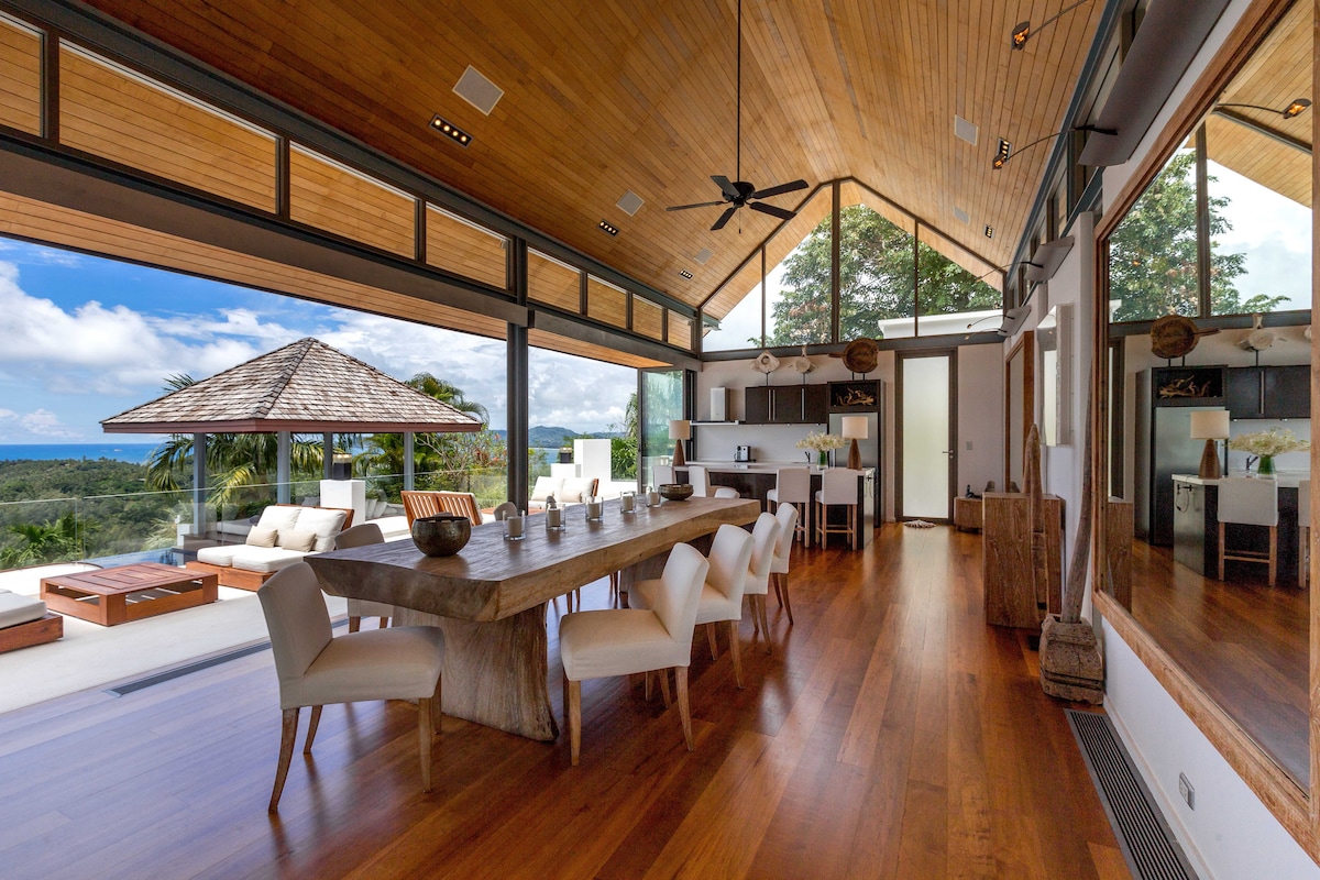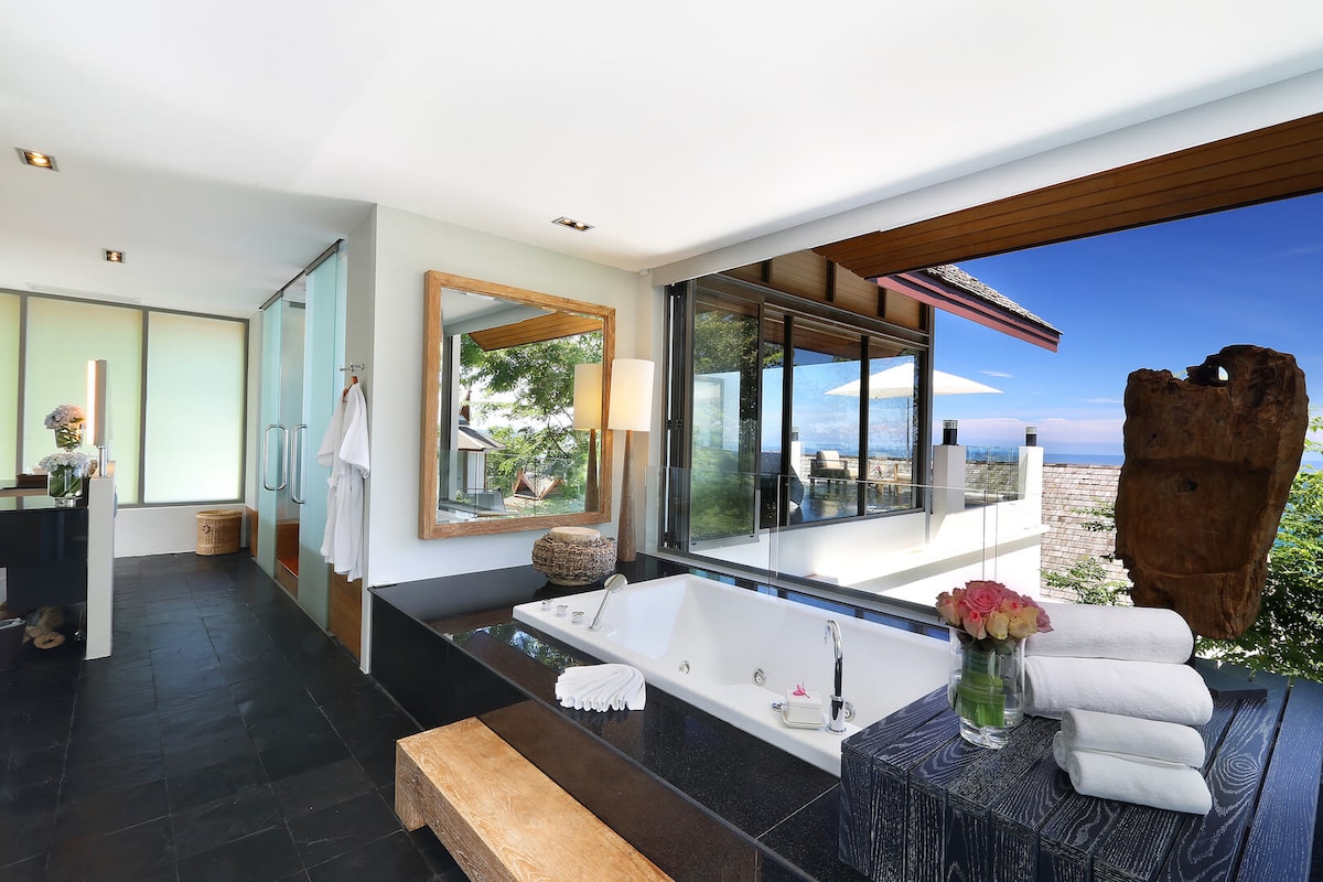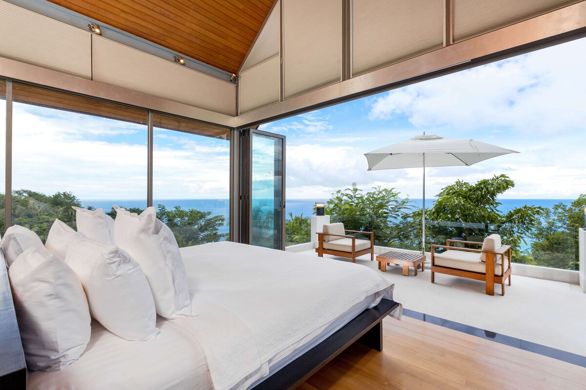 The villa’s entrance leads to a modern, glass-floored hall that boasts panoramic views of the Andaman Sea. This upper level forms the heart of the villa, and is home to its living room, dining room, broad terrace and infinity-edge swimming pool. Down on the lower level, the games room, movie room and gym offer fitness, entertainment and plenty of space to relax.Steps lead up to the master bedroom suite at the villa’s highest point. Three guest bedrooms are arranged spaciously over the ground and first floors of the main building, with two further bedrooms in the Guest Villa just steps away across the lawn. All claim equally stunning sea views.
