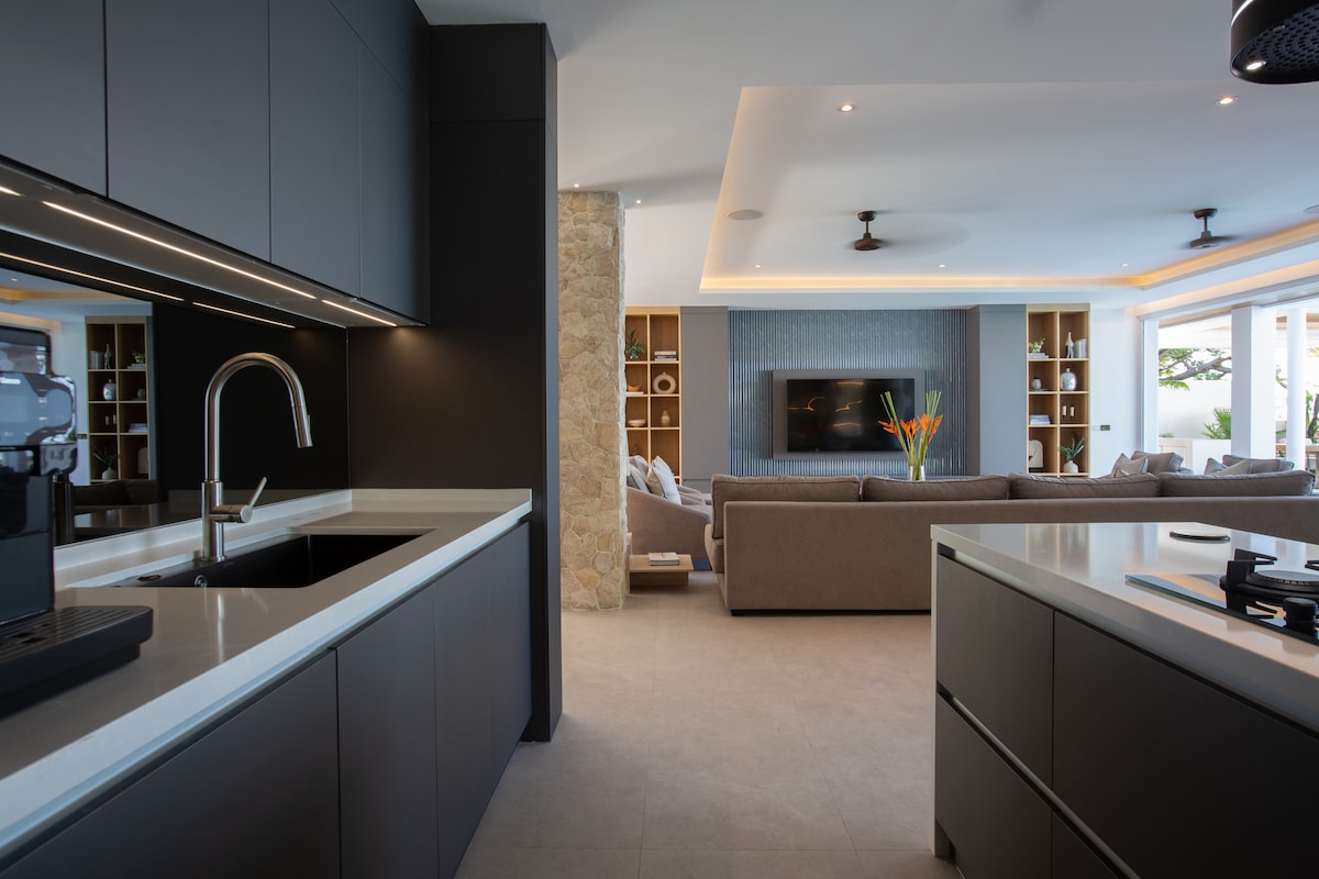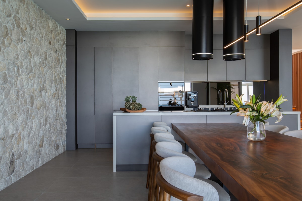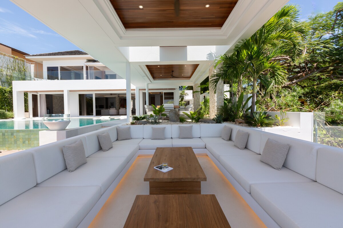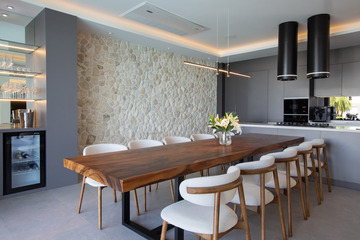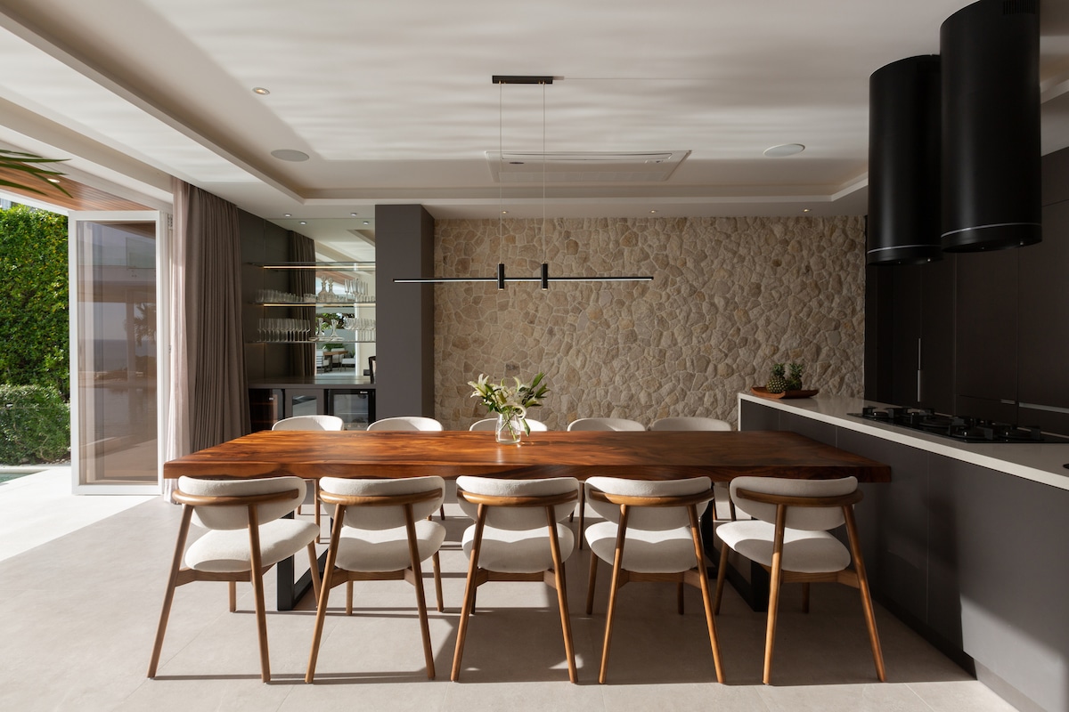 Outdoor living is at the heart of the Villa Solana experience. The expansive terrace opens to a stunning infinity-edge saltwater pool surrounded by sun loungers and shaded lounge zones. A unique sunken sala set within a shallow reflecting pool creates the perfect spot for sunset cocktails or late-night chats under the stars. Alfresco dining is made effortless with a 16-seat dining table and service bar, shaded by a stylish cantilevered canopy.