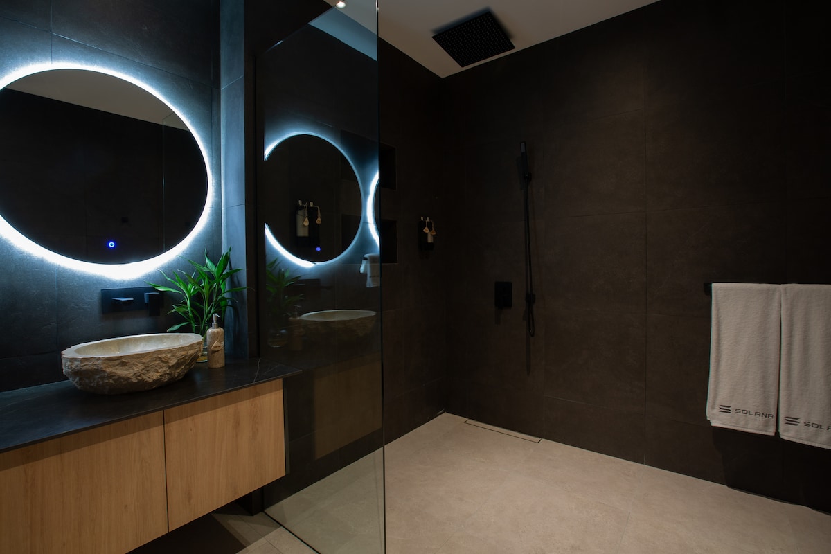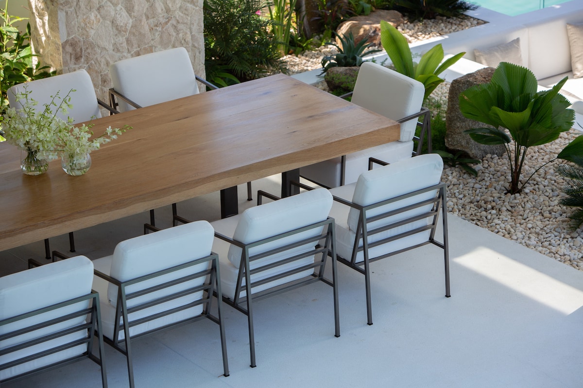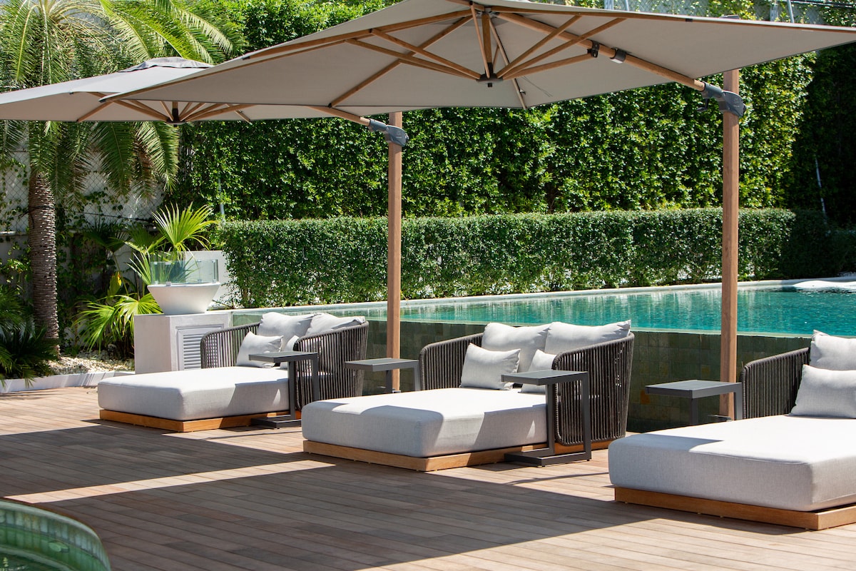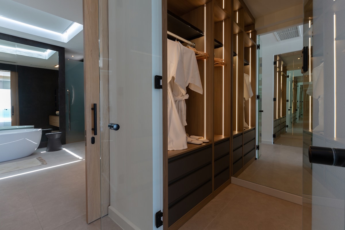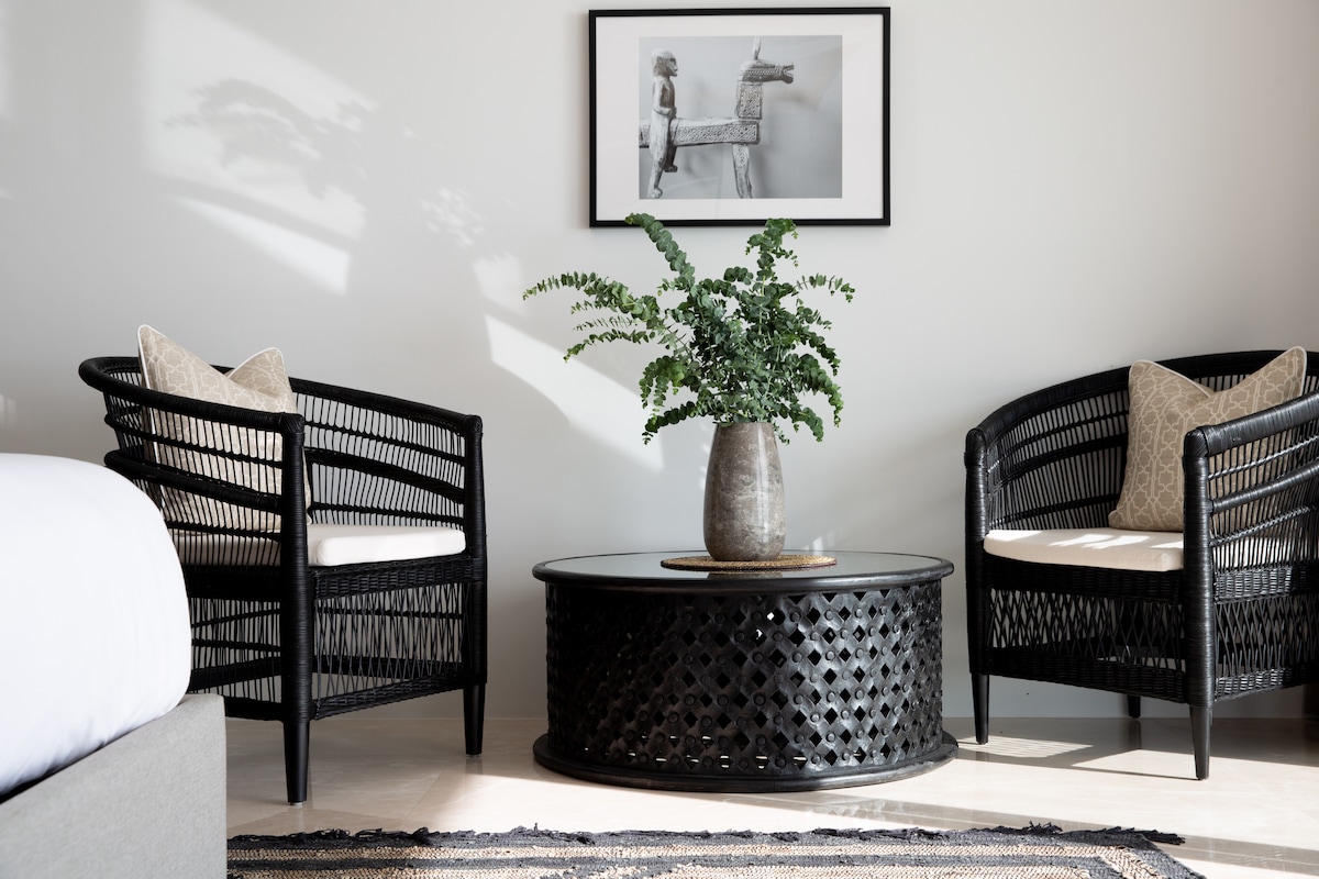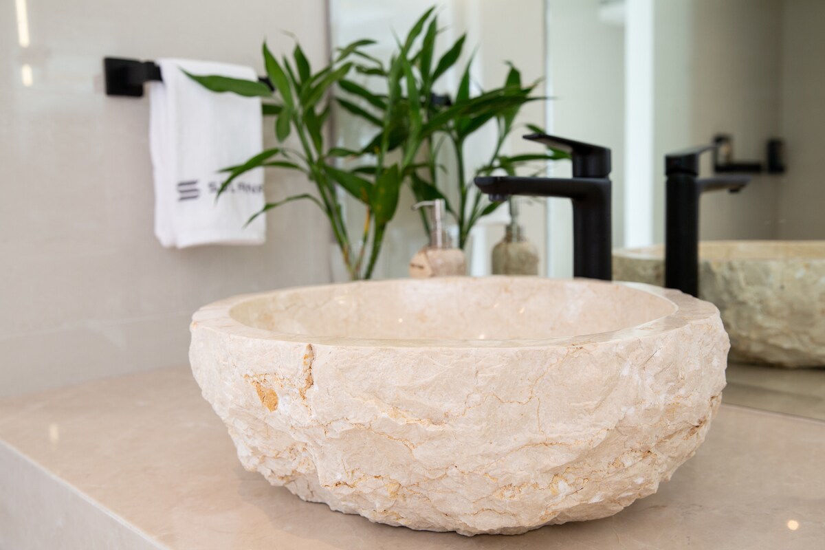 Outdoor living is at the heart of the Villa Solana experience. The expansive terrace opens to a stunning infinity-edge saltwater pool surrounded by sun loungers and shaded lounge zones. A unique sunken sala set within a shallow reflecting pool creates the perfect spot for sunset cocktails or late-night chats under the stars. Alfresco dining is made effortless with a 16-seat dining table and service bar, shaded by a stylish cantilevered canopy.