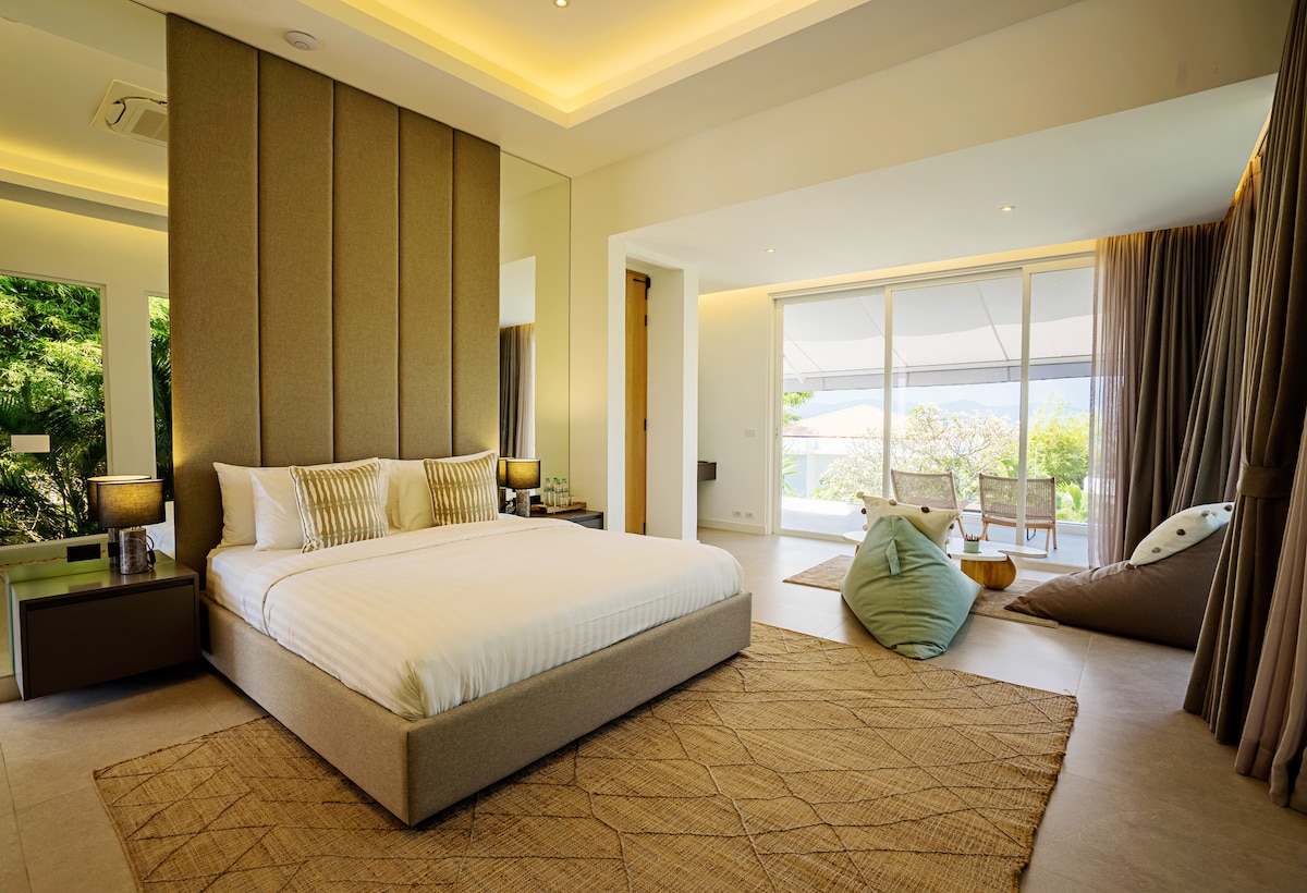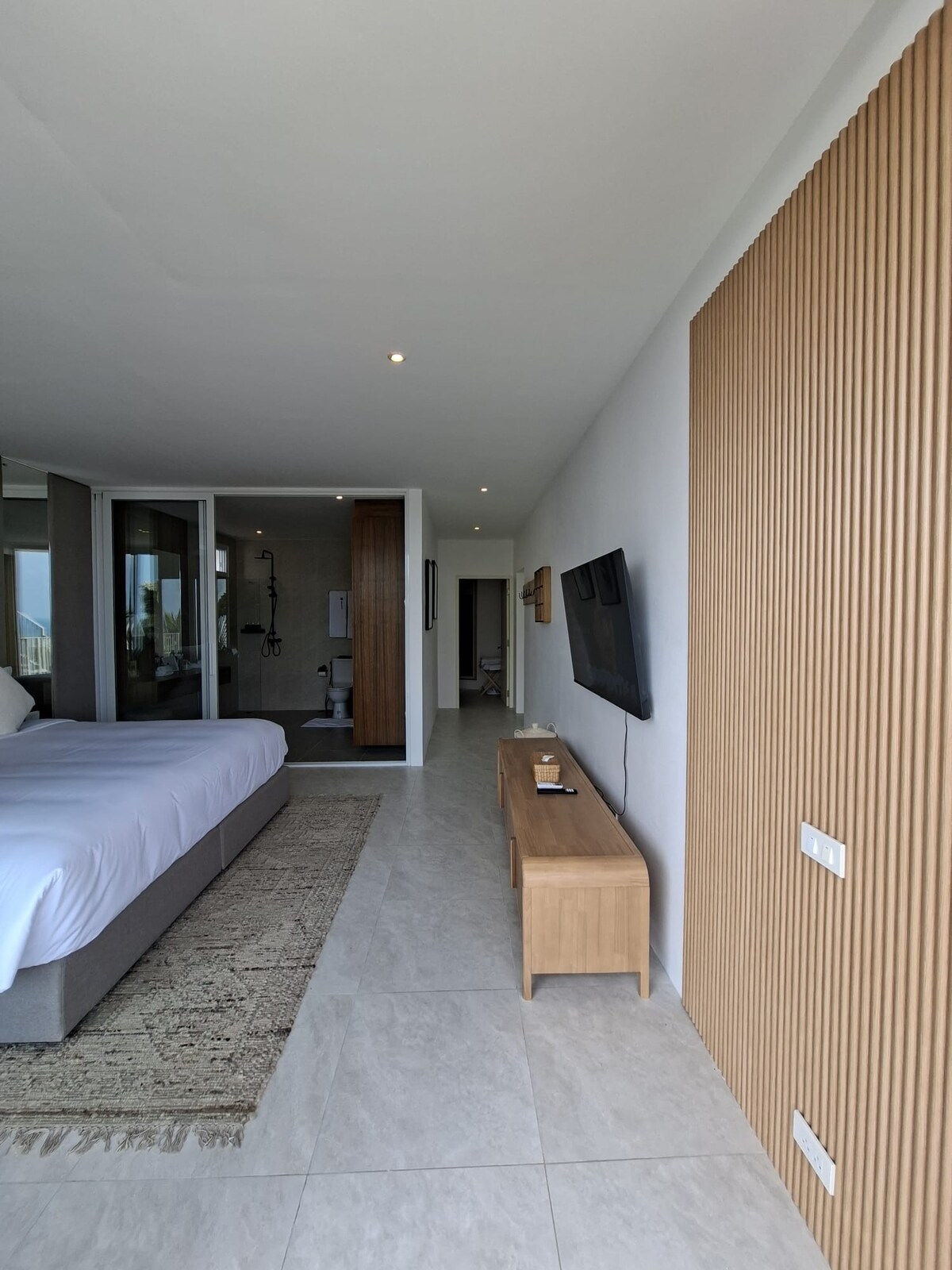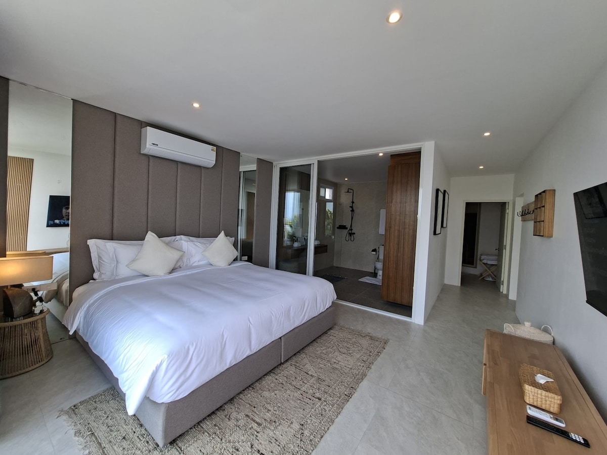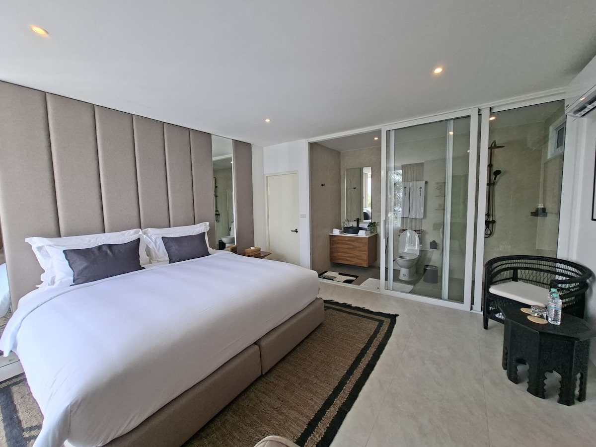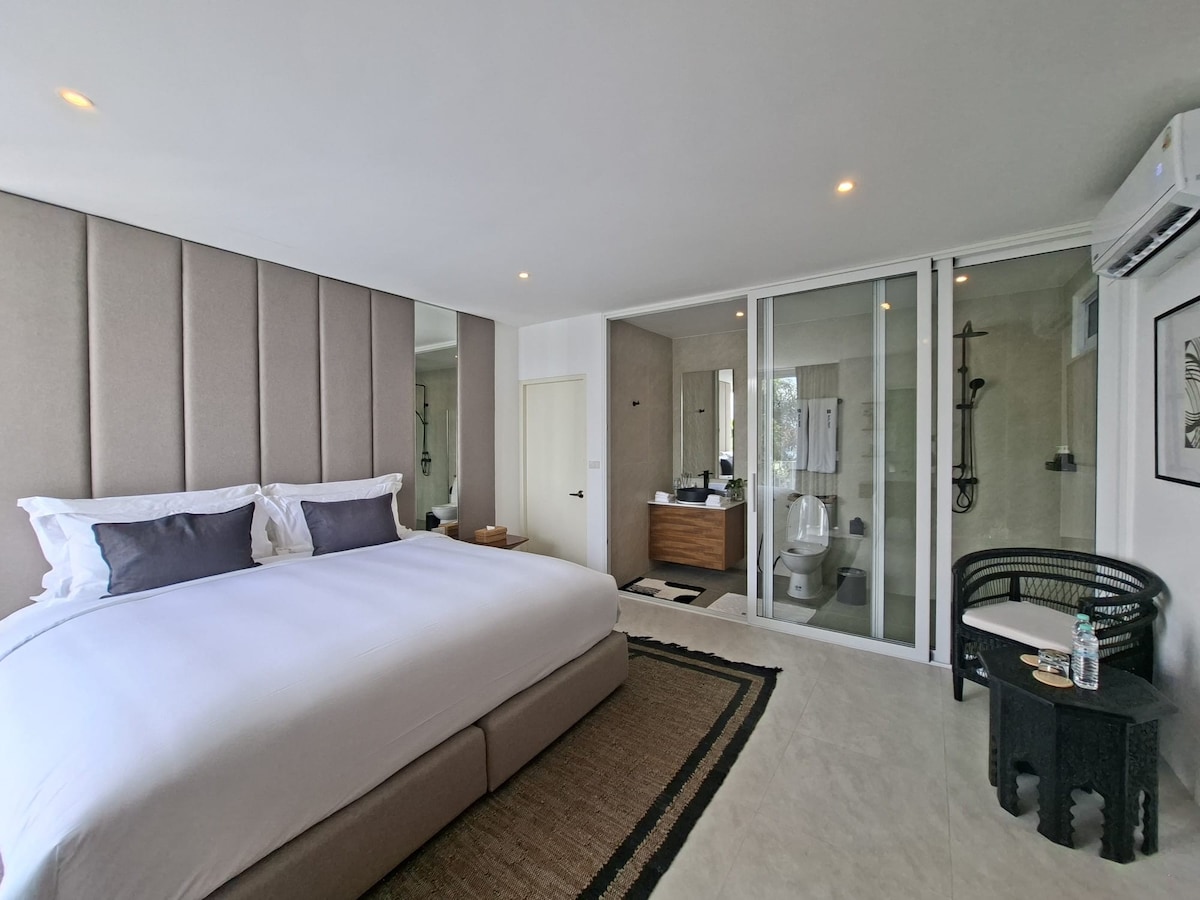 * Master Suite: Upper-level retreat with king bed, work desk, private sea-view terrace, and spa-like ensuite with walk-in rain shower and freestanding tub.
