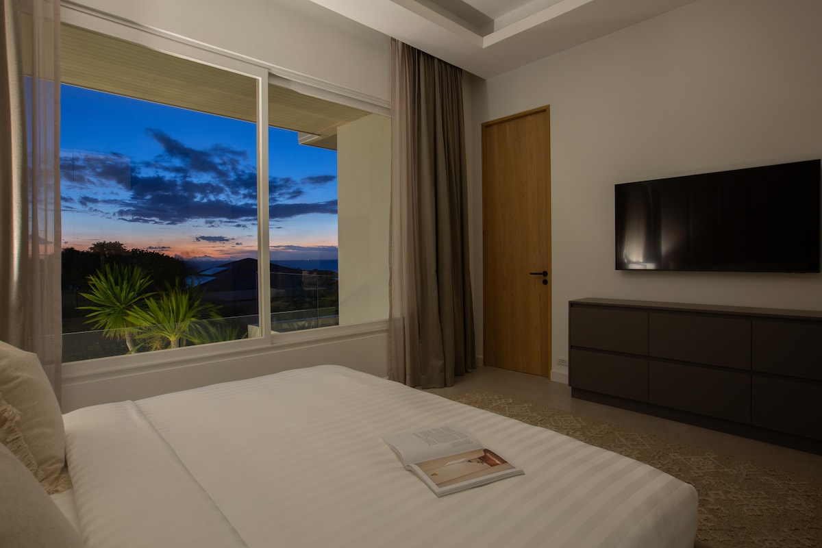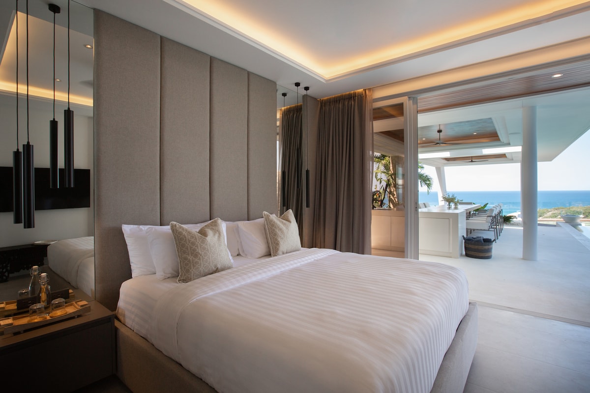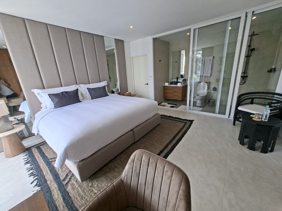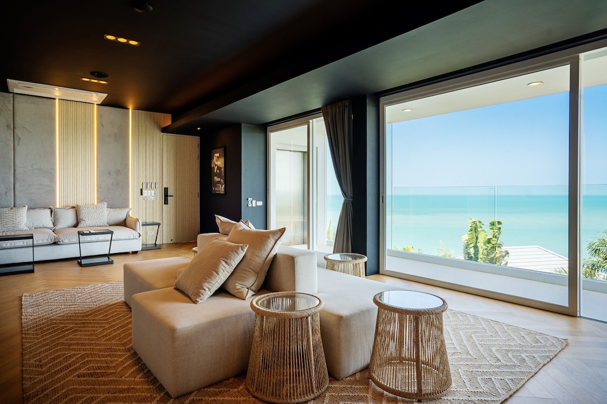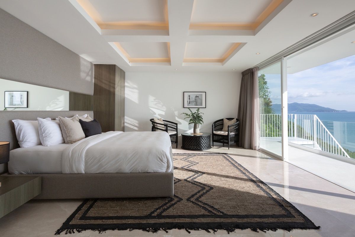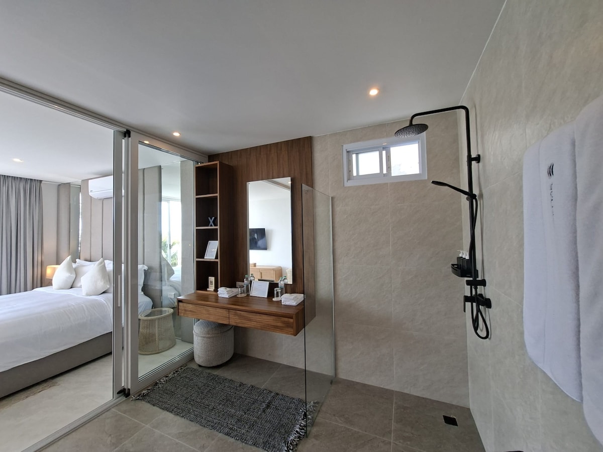 * Master Suite: Upper-level retreat with king bed, work desk, private sea-view terrace, and spa-like ensuite with walk-in rain shower and freestanding tub.
