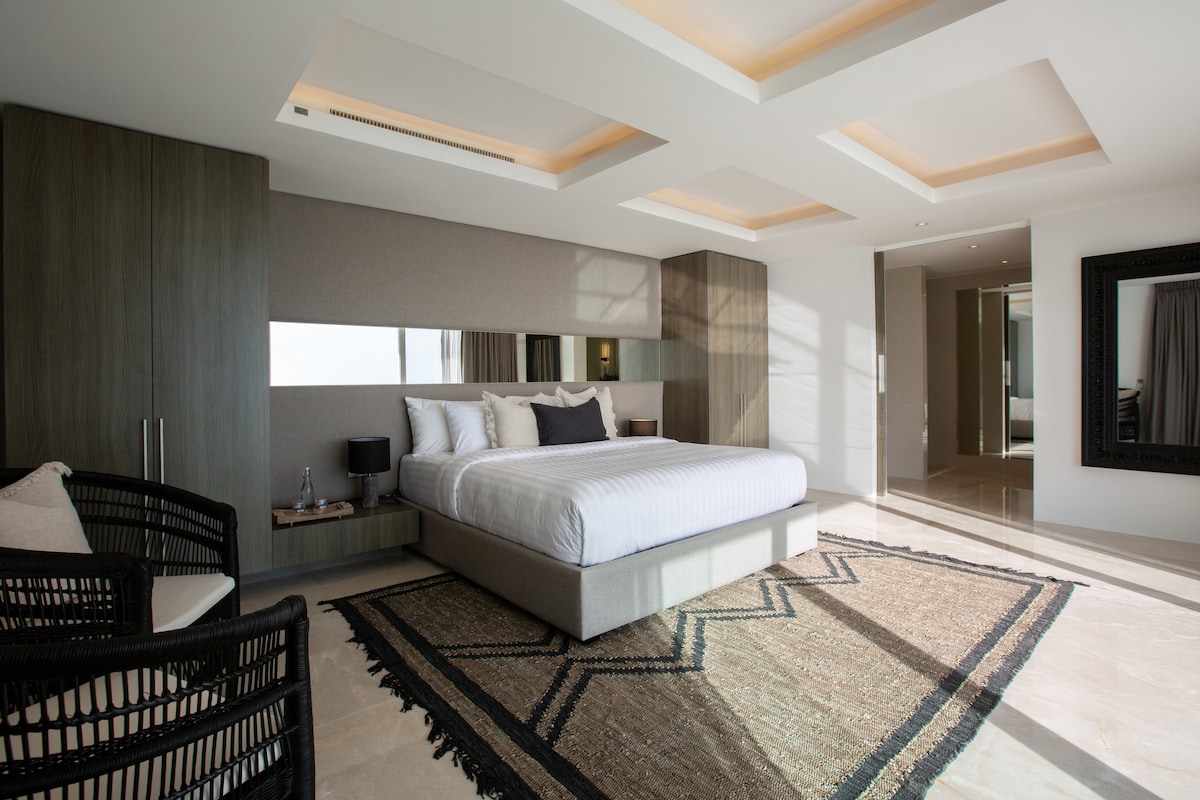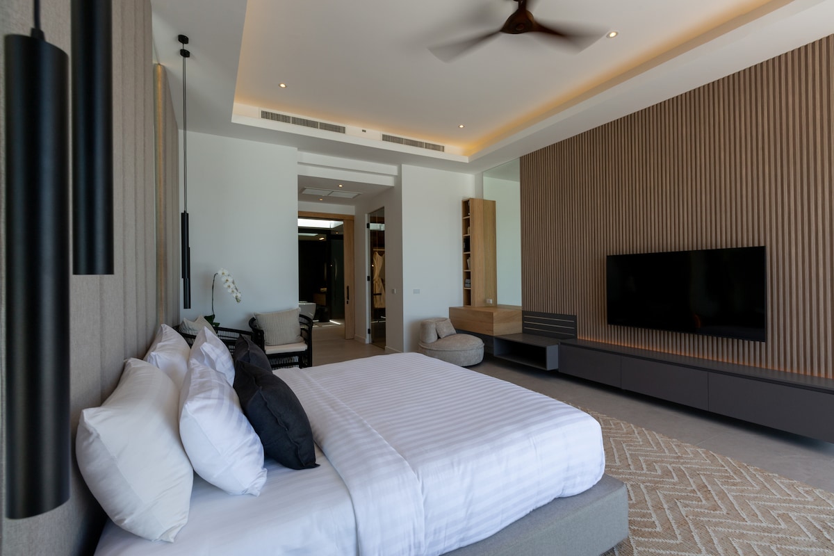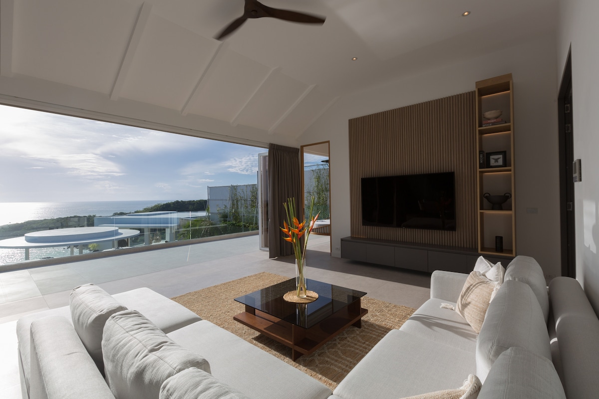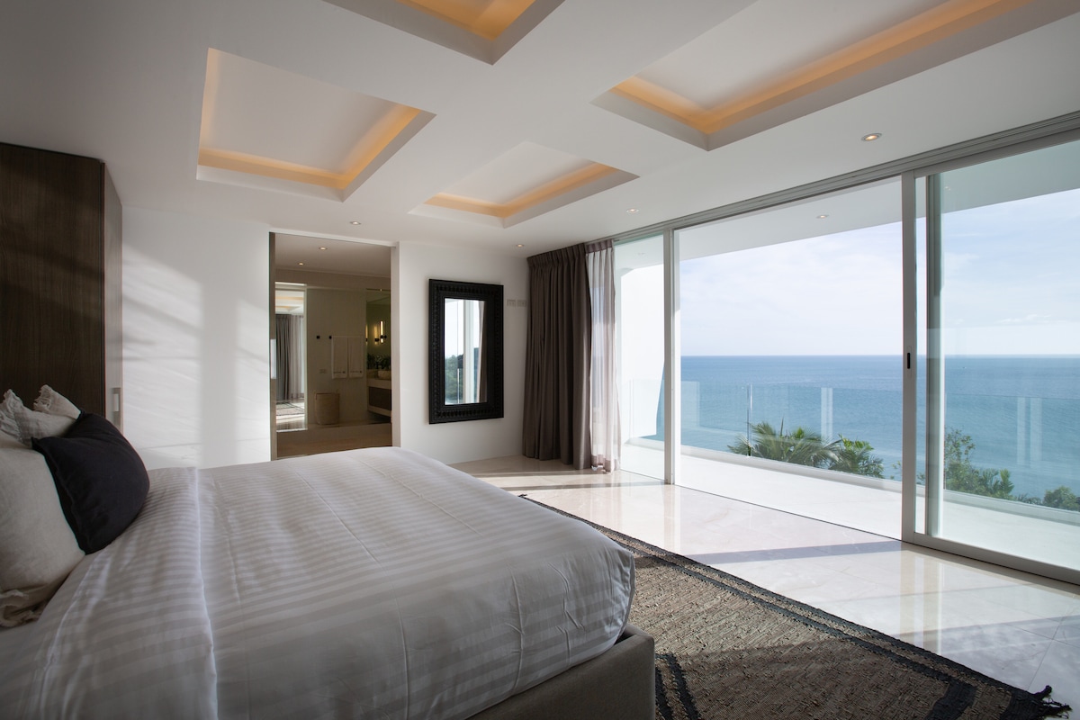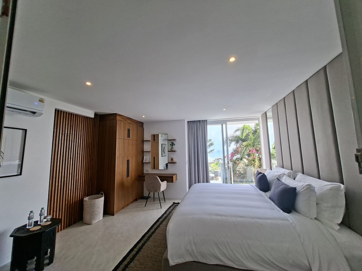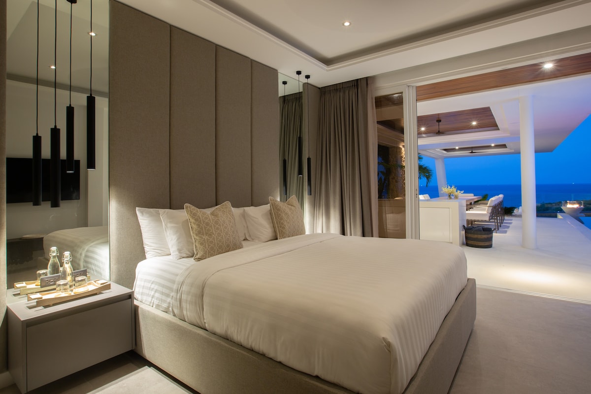 * Master Suite: Upper-level retreat with king bed, work desk, private sea-view terrace, and spa-like ensuite with walk-in rain shower and freestanding tub.