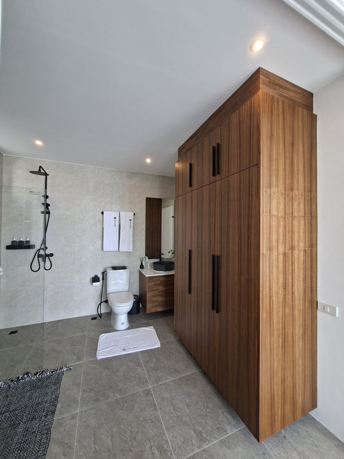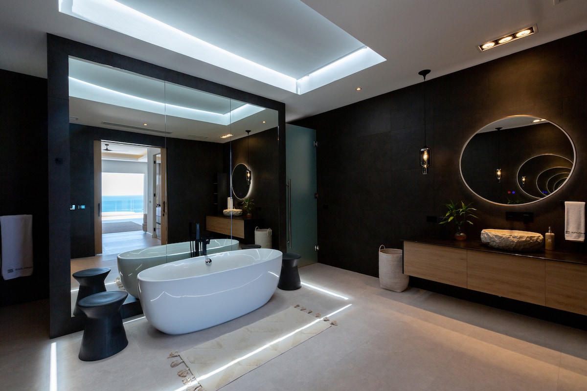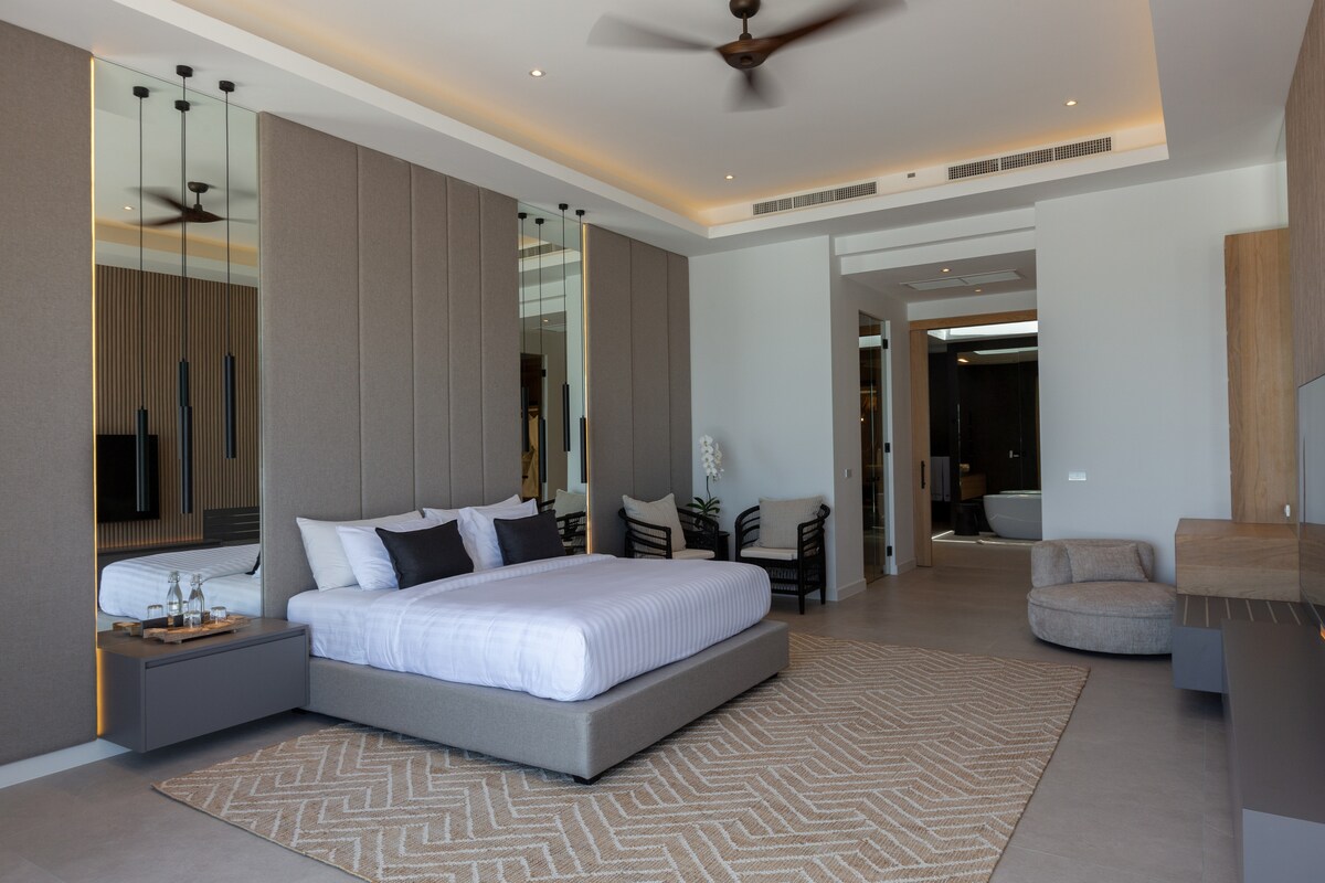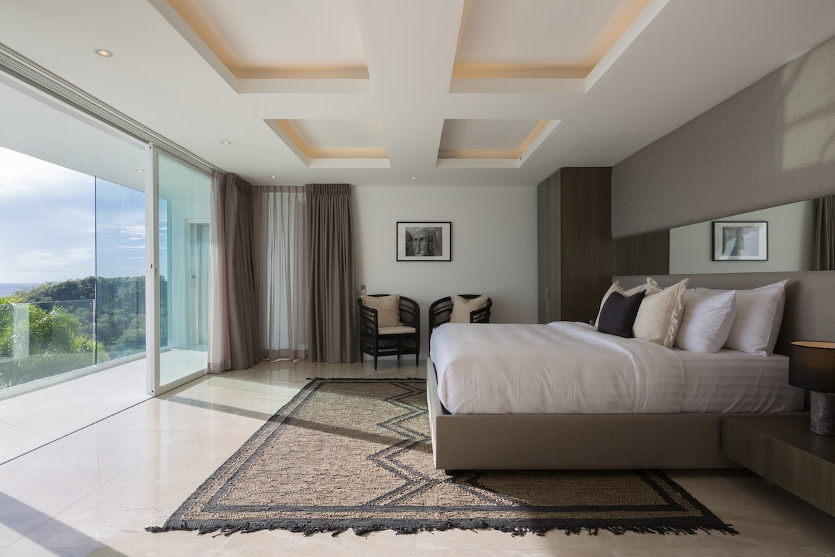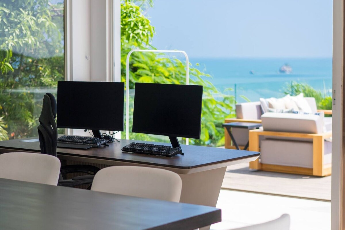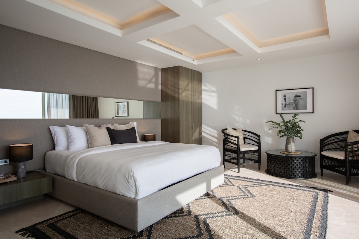 * Master Suite: Upper-level retreat with king bed, work desk, private sea-view terrace, and spa-like ensuite with walk-in rain shower and freestanding tub.